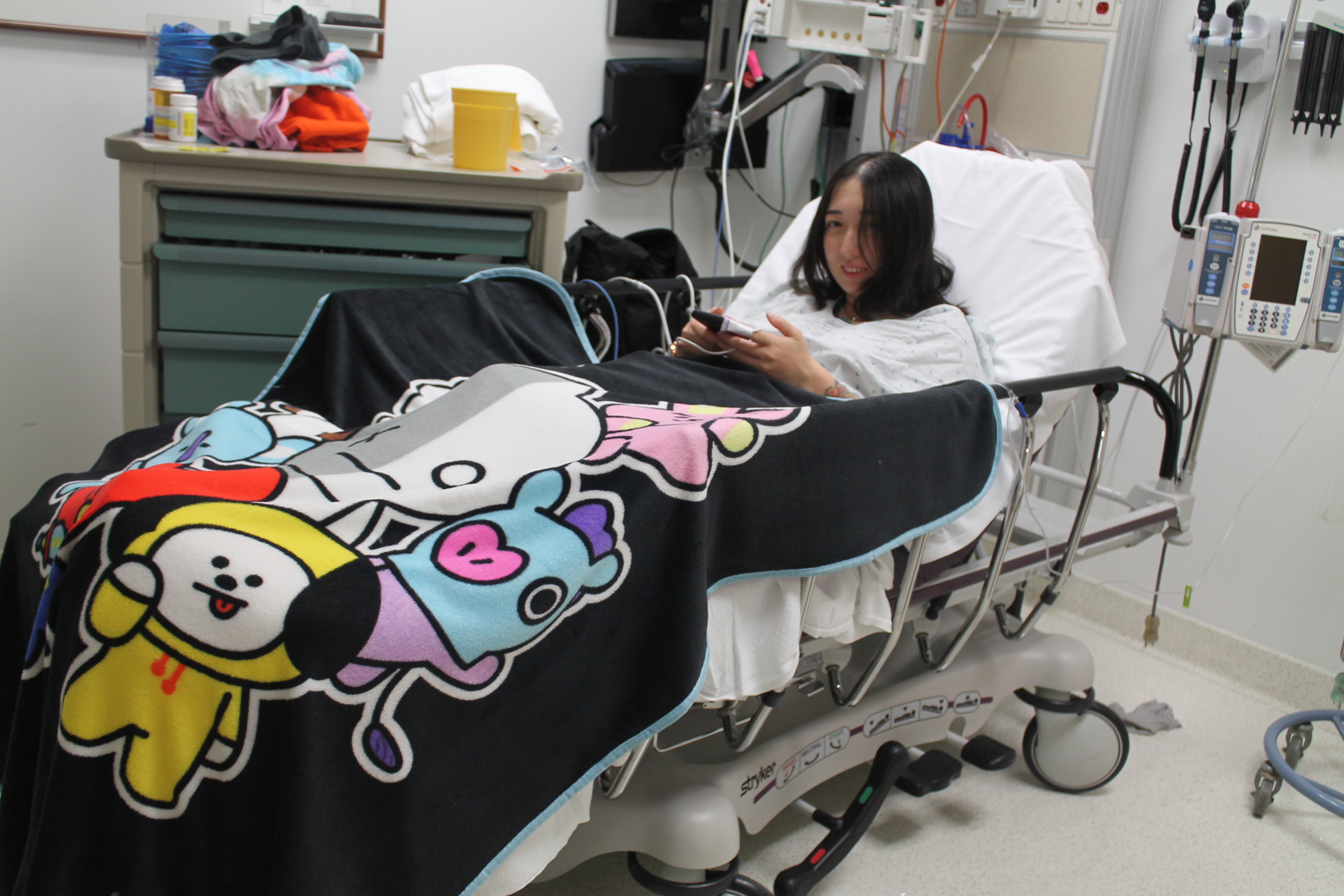 아라의 마음에 큰 위로가 되어준 방탄소년단의 담요를 덮어 주었더니 좋아한다.