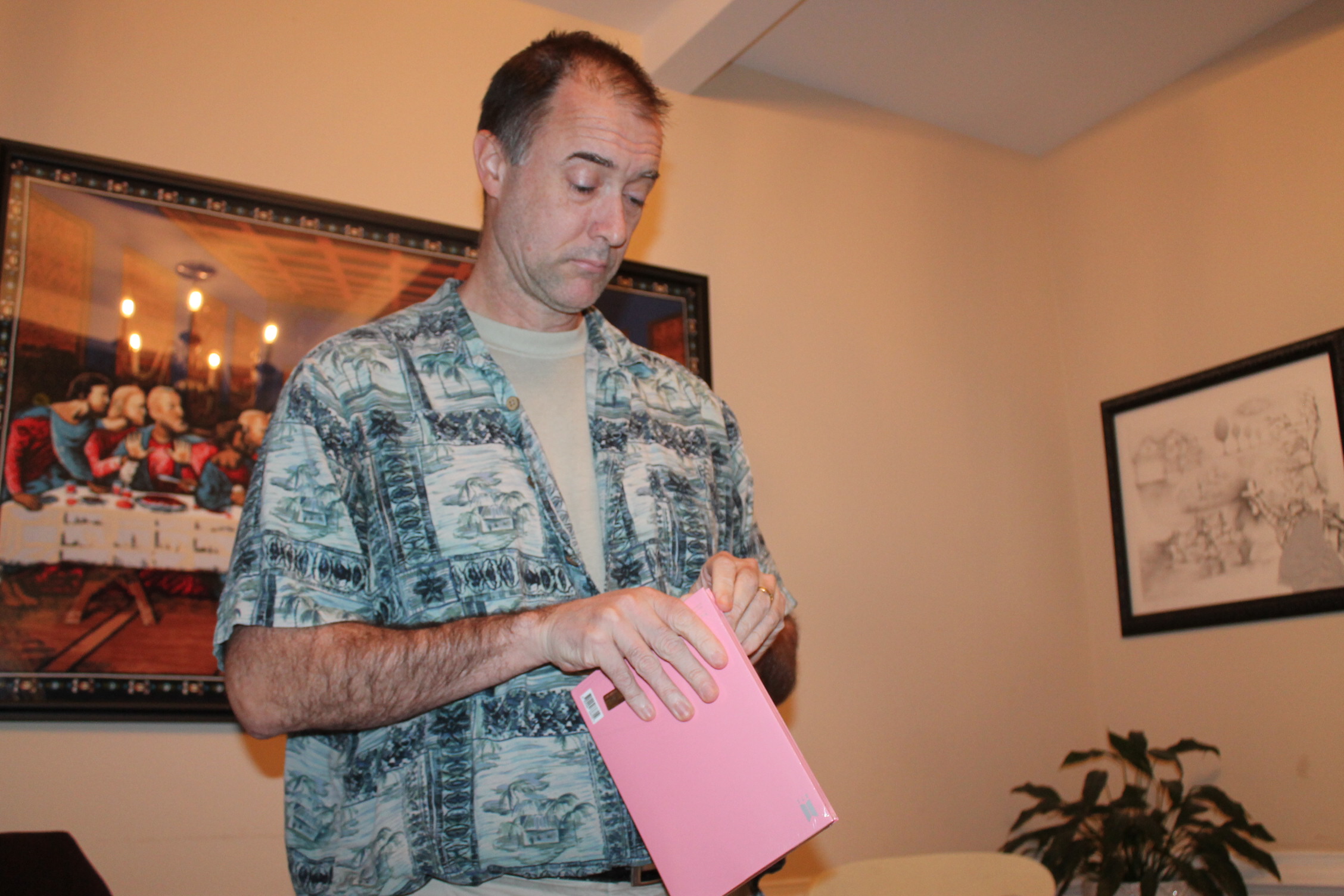 시디 안을 보기 위해서 포장지를 뜯고 있는 중이다.