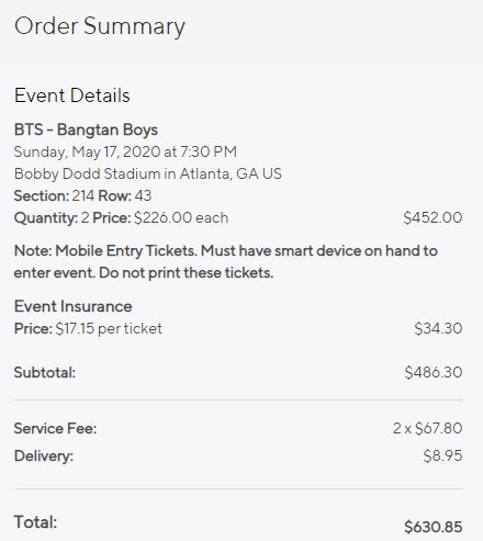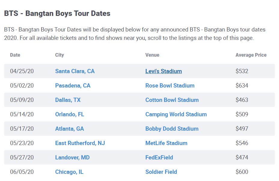 BTS 미국 공연 티켓 가격