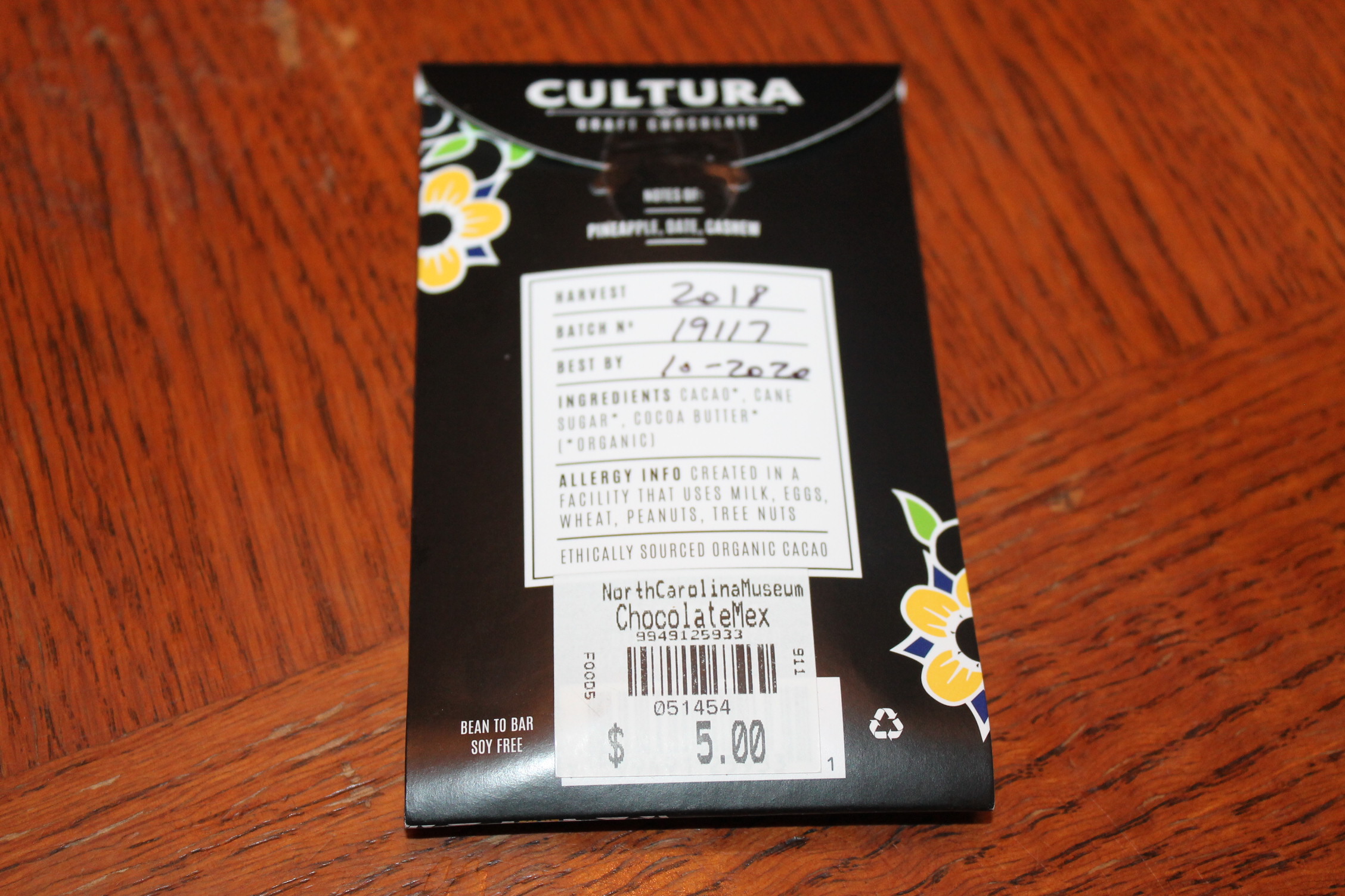이렇게 작은 초콜릿 이 5불짜리야. 멕시코 코코아가 70프로 들었다고 하네. 이 초콜릿이 비싼 이유는 수제 초콜릿이라 그렇단다. 저기 봐. 2018년도 만들었다고 적혀 있지? 아무튼 비싼 초콜릿이었어.