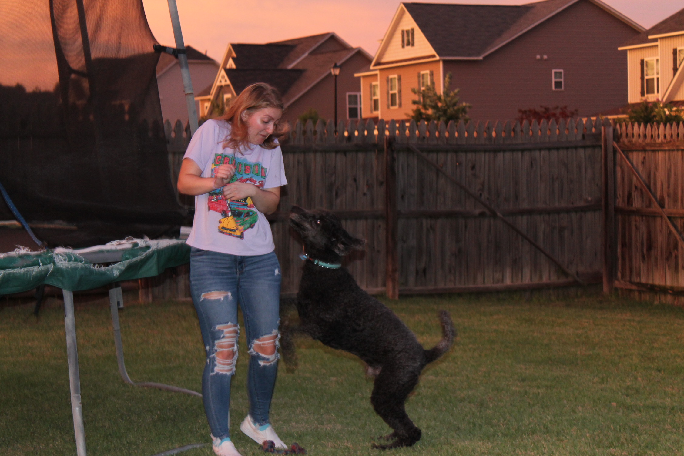 잠시 아폴로가 신나게 뛰는 사이 남자 친구와 트램펄린을 한다.