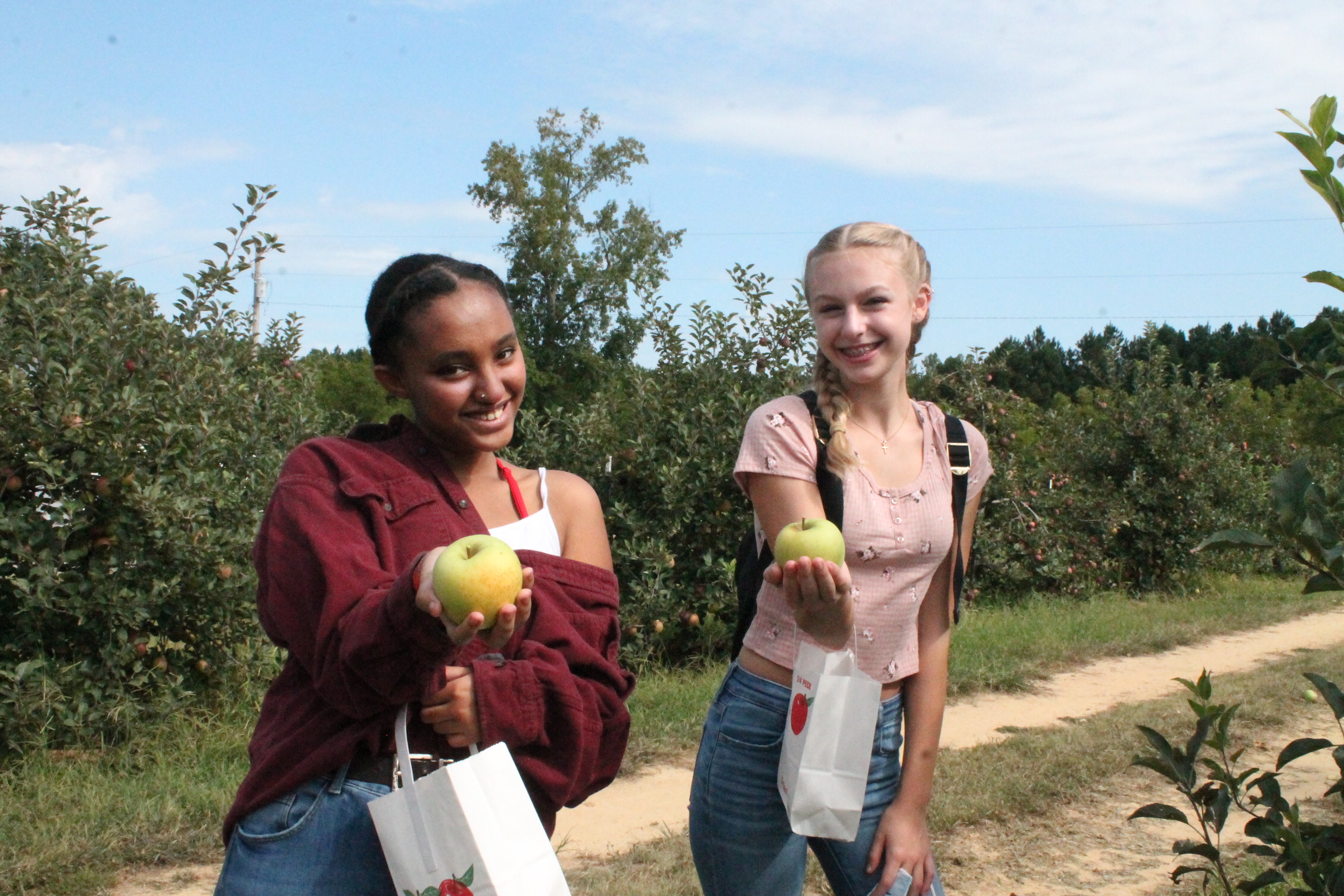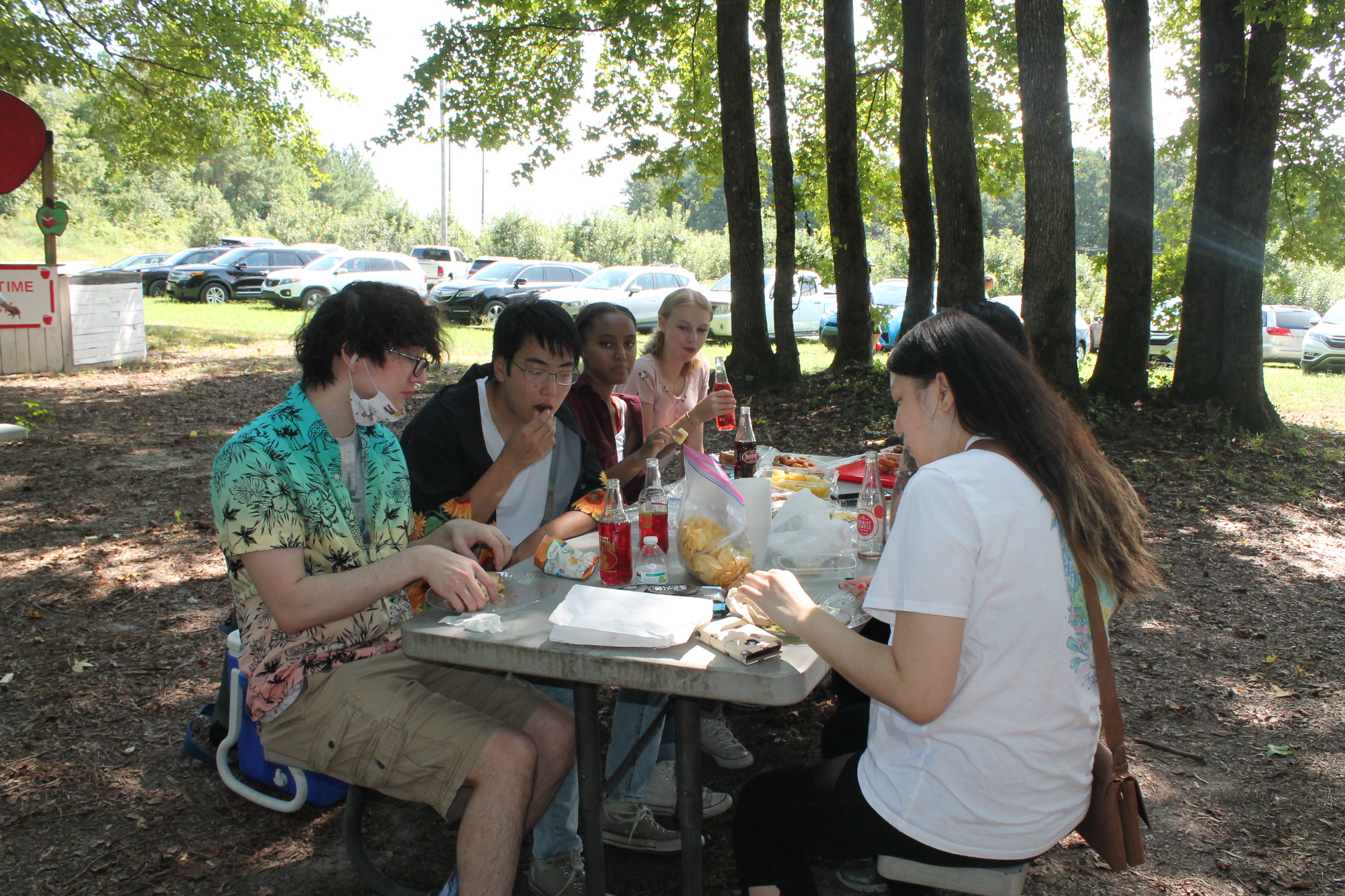 이제 우리 모두 사과를 다 따고 점심을 먹으러 간다.