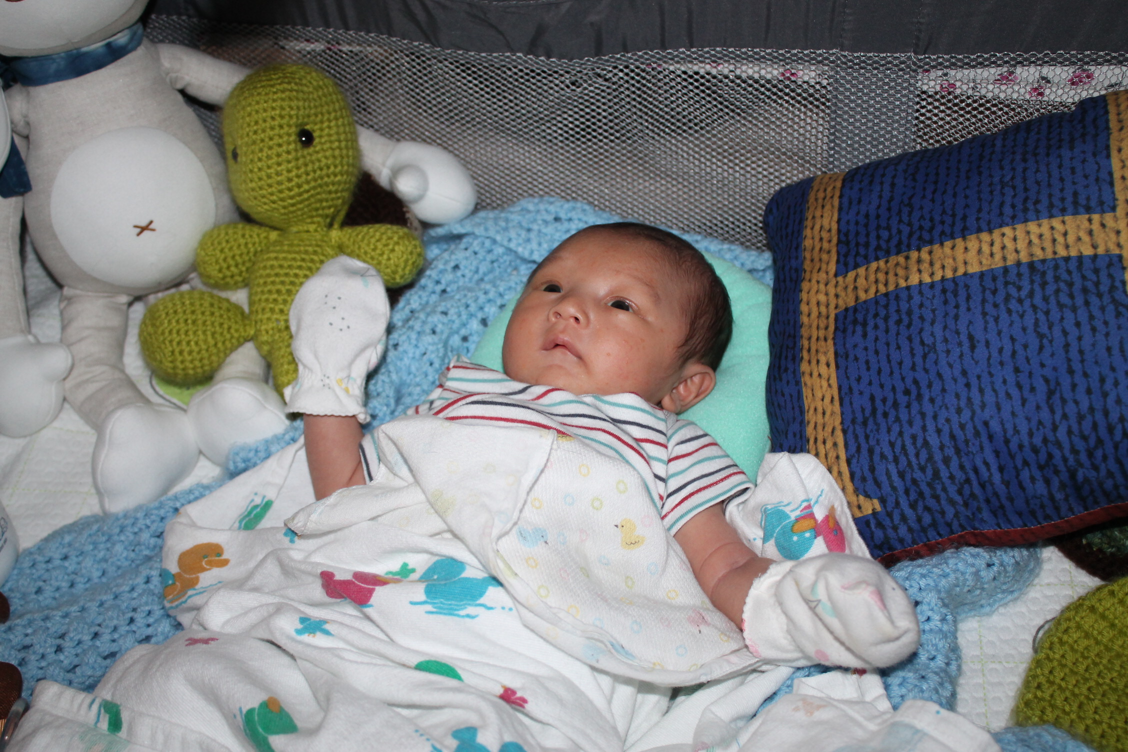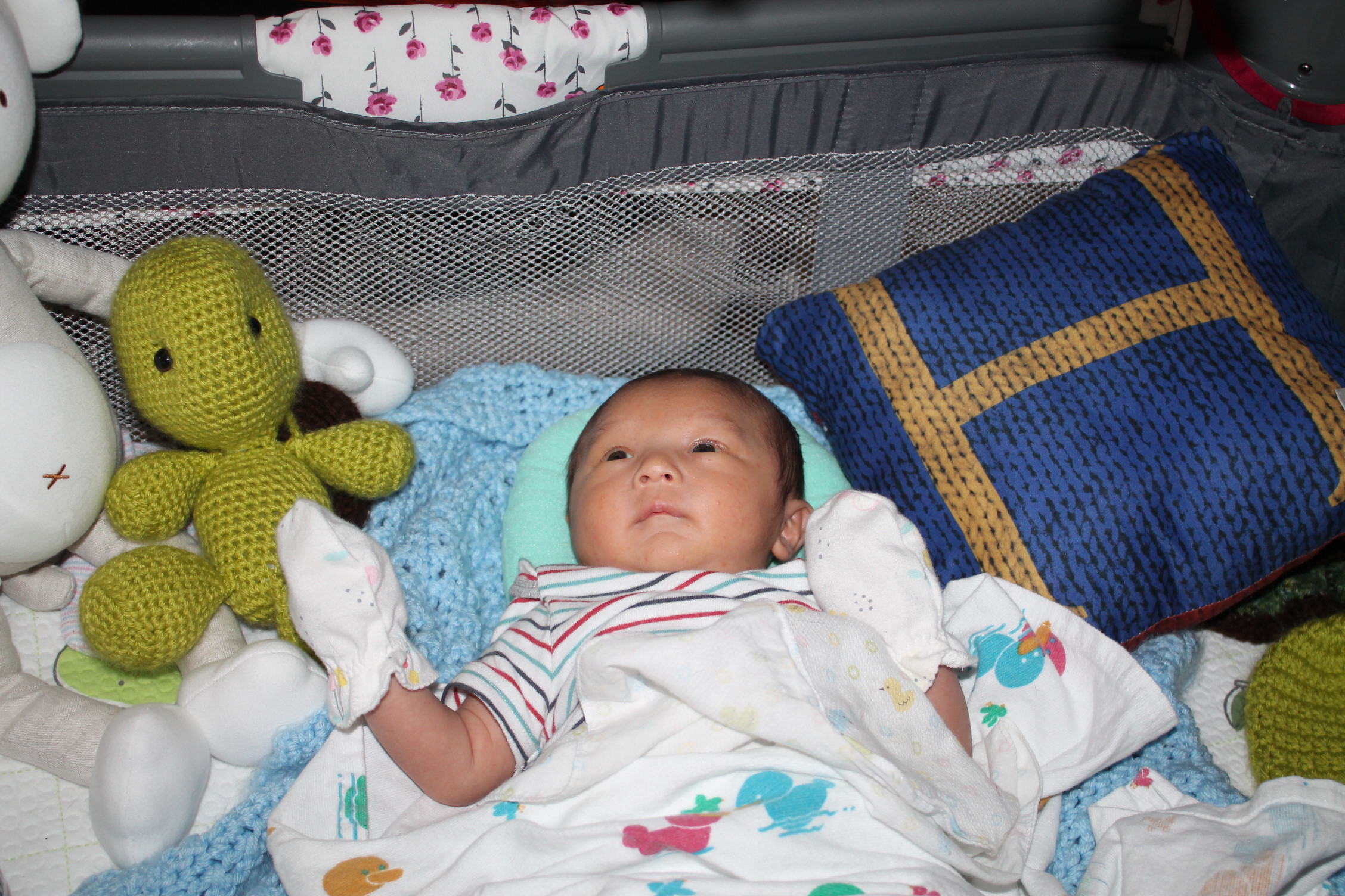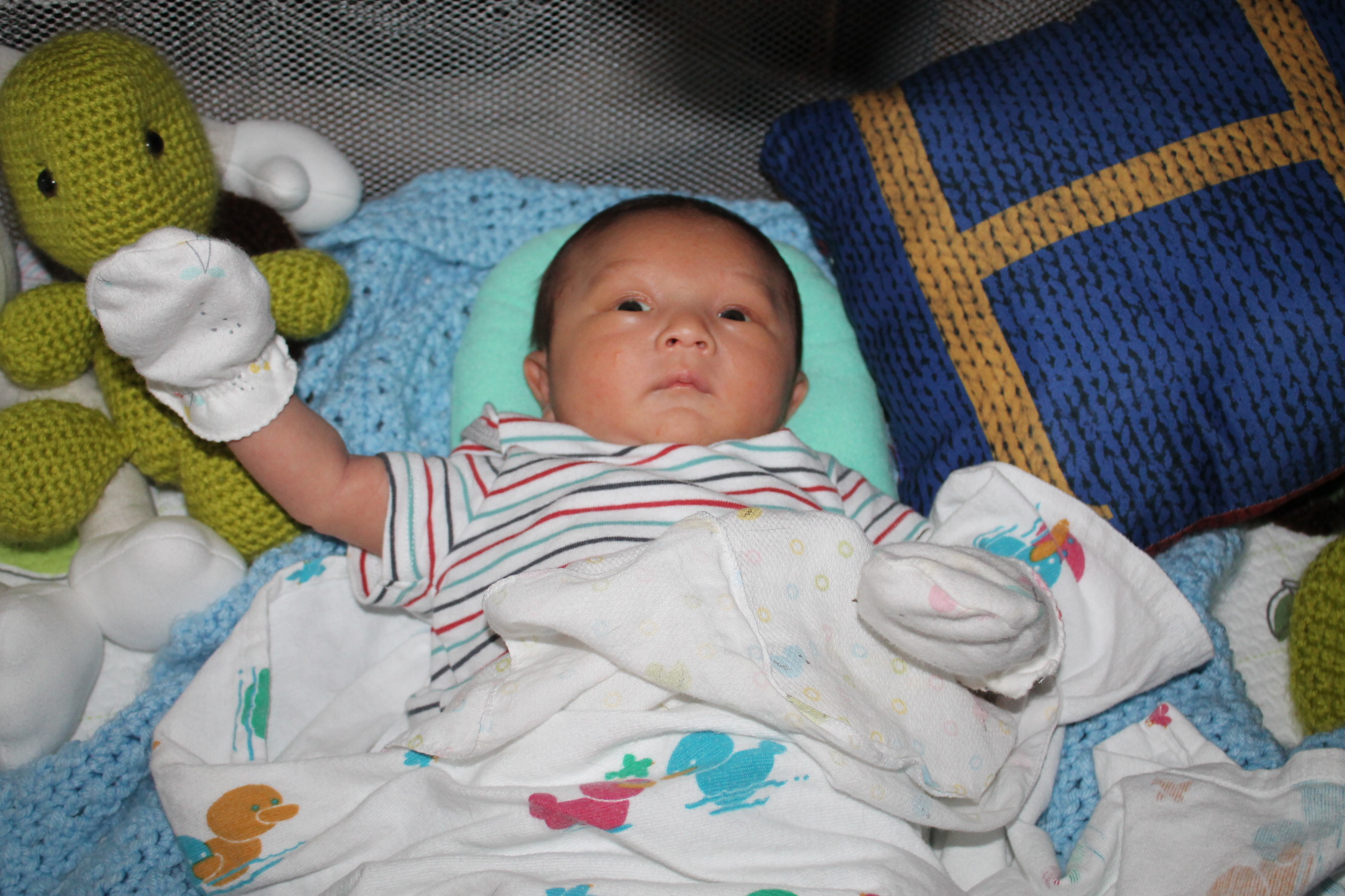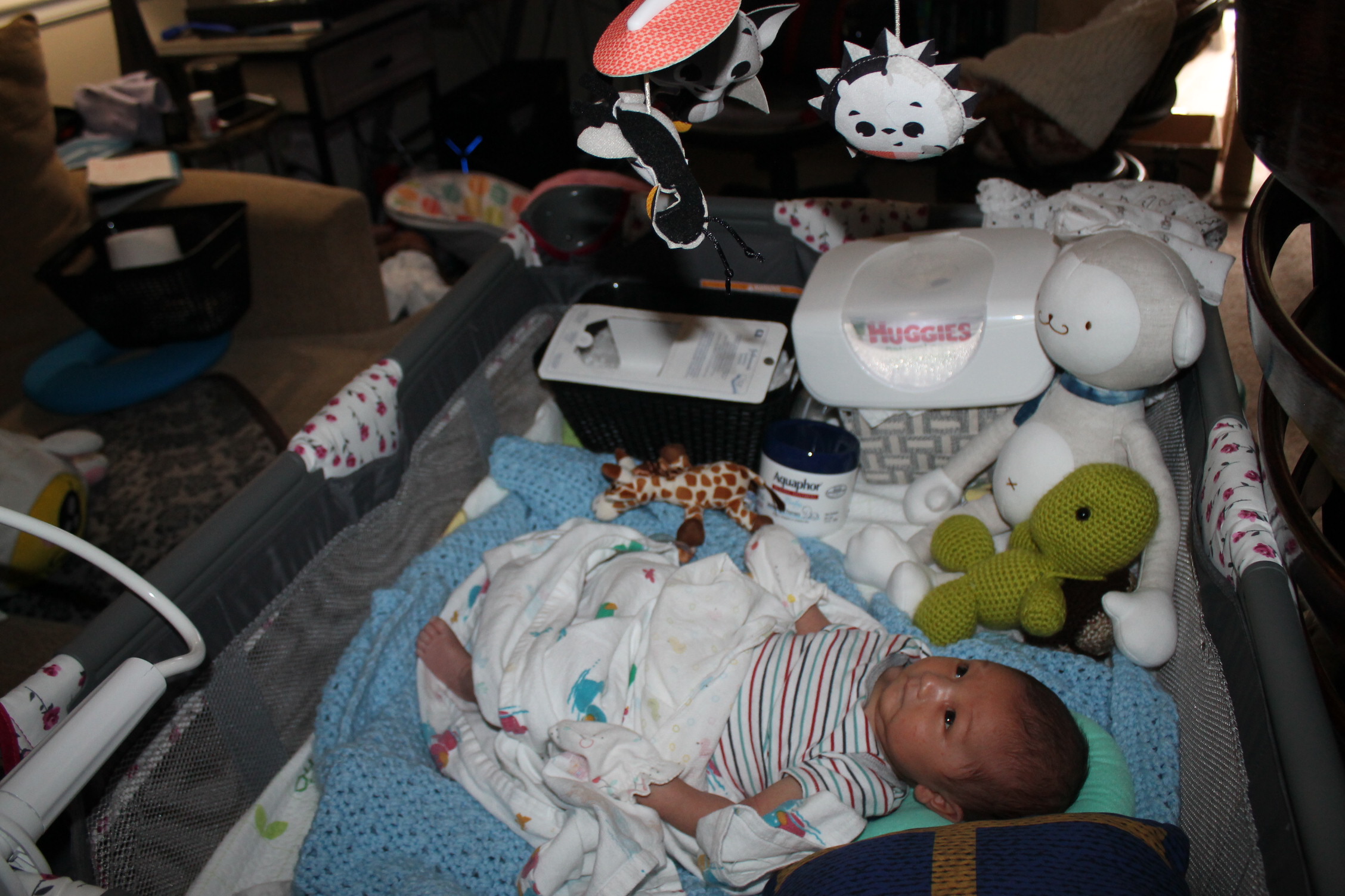 새로운 세상을 적응해 나가는 노엘은 모빌을 좋아하고 반응한다. 손을 높게 들고 마치 춤을 추는 동작을 하듯이 발도 같이 움직인다. 눈동자의 초점은 모빌에 고정되어 있고 집중적인 움직임을 관찰한다. 신비로운 세상을 발견한 사람처럼 좋아한다. 모빌을 달아 두기를 참 잘한 것 같다. 노엘이 이렇게 좋아할 줄은 몰랐다.