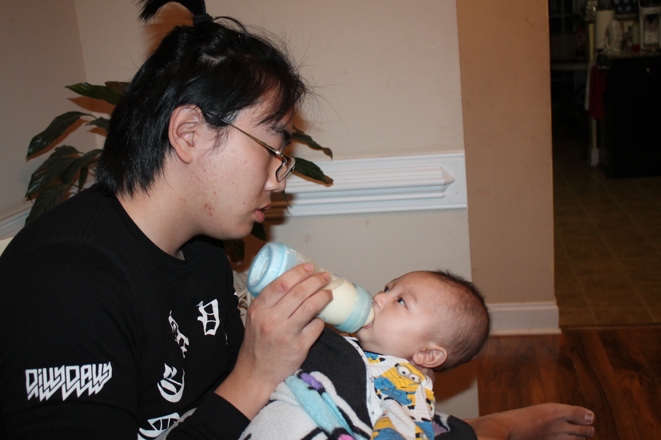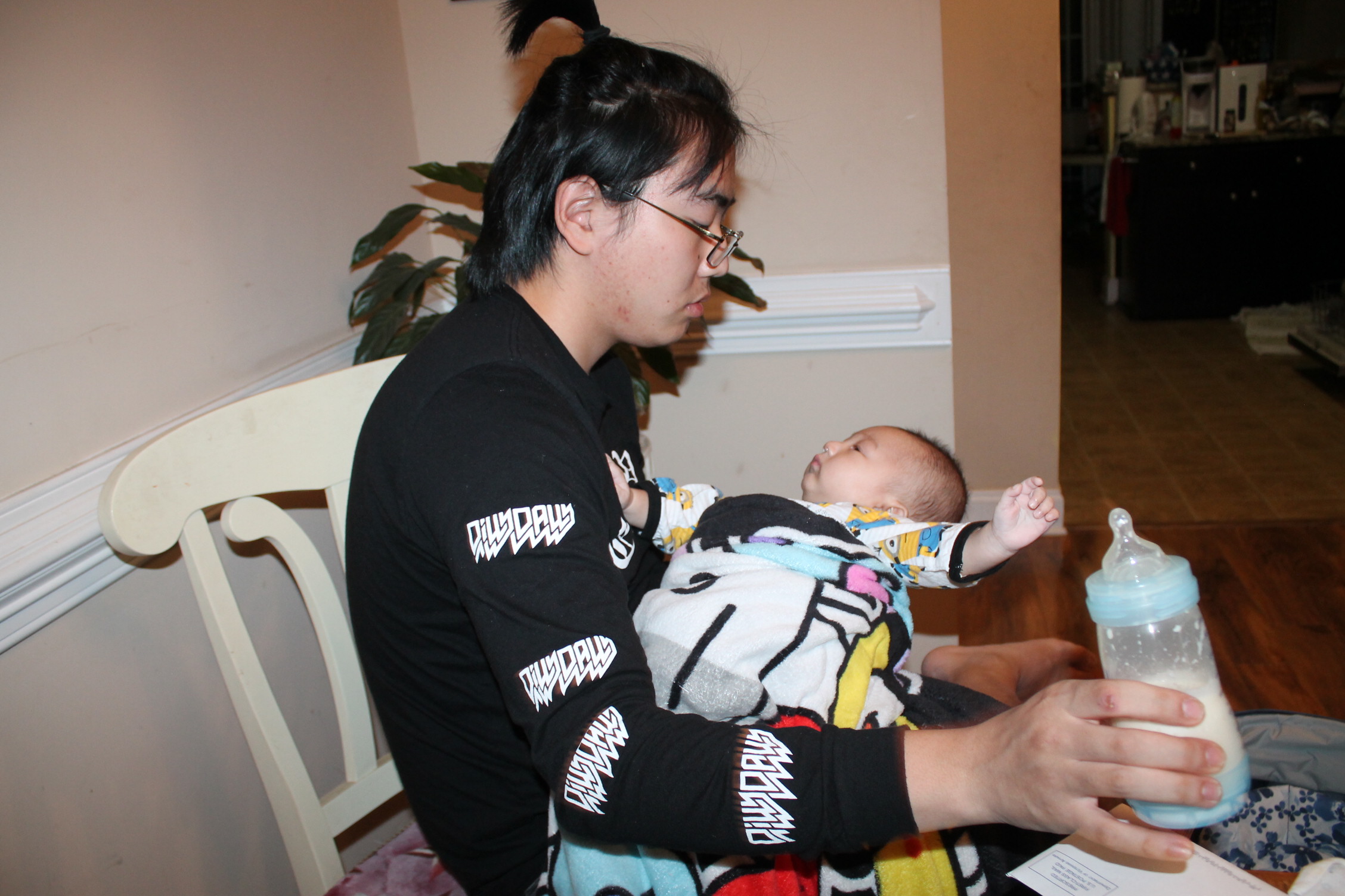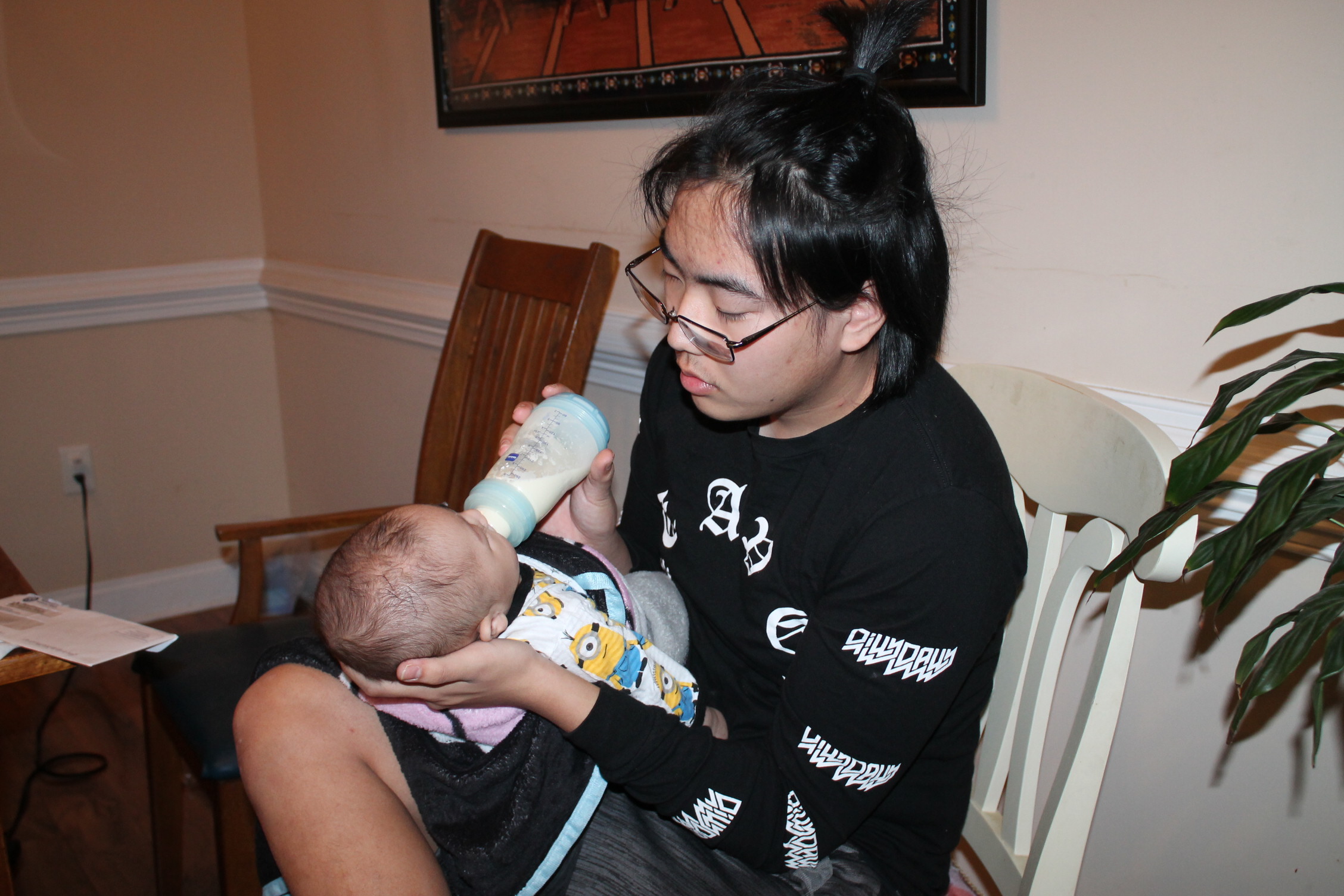 삼촌은 모든 것이 새롭다. 아기 우유 먹이는 것도 아기를 돌보는 자체가 신기하다. 모든 것이 새롭게 다가 온 삼촌이 이번에는 우유 먹이는 작업에 도전한다. 삼촌은 어느 정도가 적당 양인지 모른 채 계속 노엘 입으로 젖병을 밀어 넣었다. 이런 모습을 본 노엘은 극구 반대의 표시로 젖병 입으로 밖으로 밀어내고 있었다.