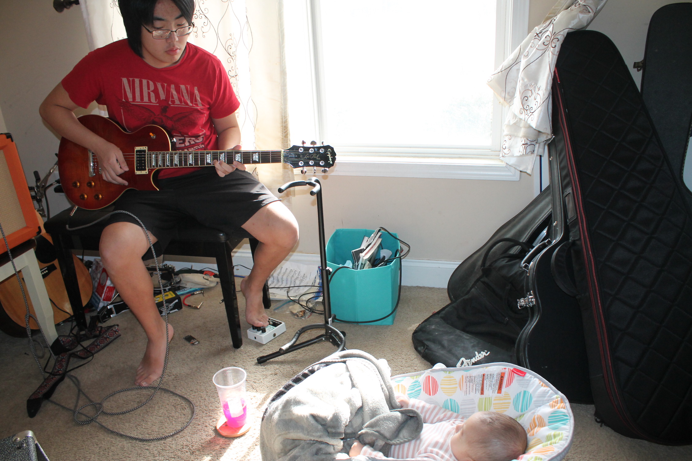 아직 걷지도 못해서 기타 연주는 포기했어요.