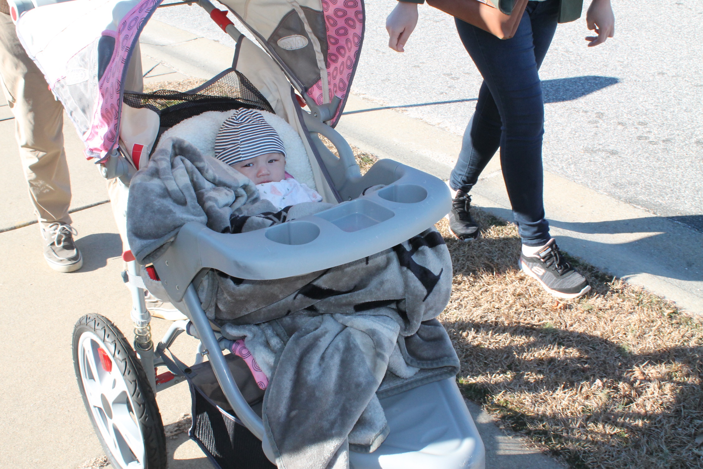 처음 보는 세상처럼 모든 것이 신기했어요. 그래서 유모차로 외출해본 경험은 아주 좋았어요. 다음에도 기회가 되면 또 나가고 싶어요. 하지만 날씨가 조금 춥기는 했어요. 엄마는 내가 추울까 봐 두꺼운 담요를 덮어 주셨어요. 엄마와 아빠가 함께 앞장을 서고 뒤를 할아버지 할머니가 따라오고 있었어요.
