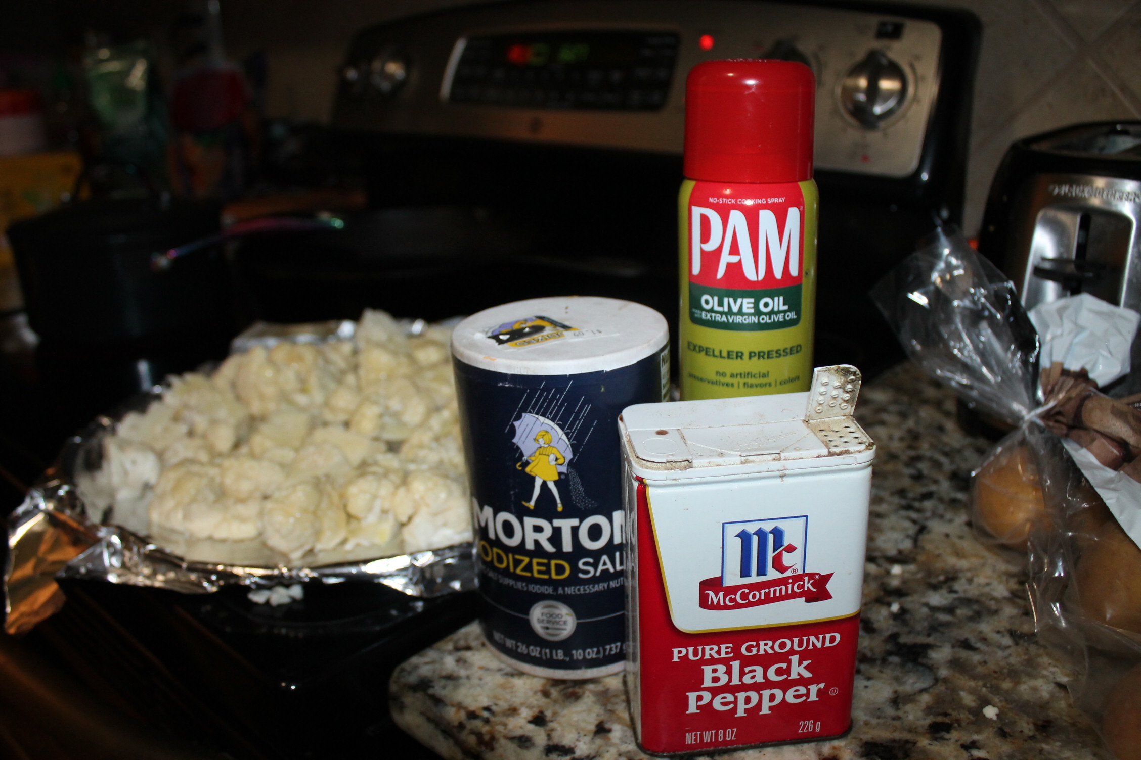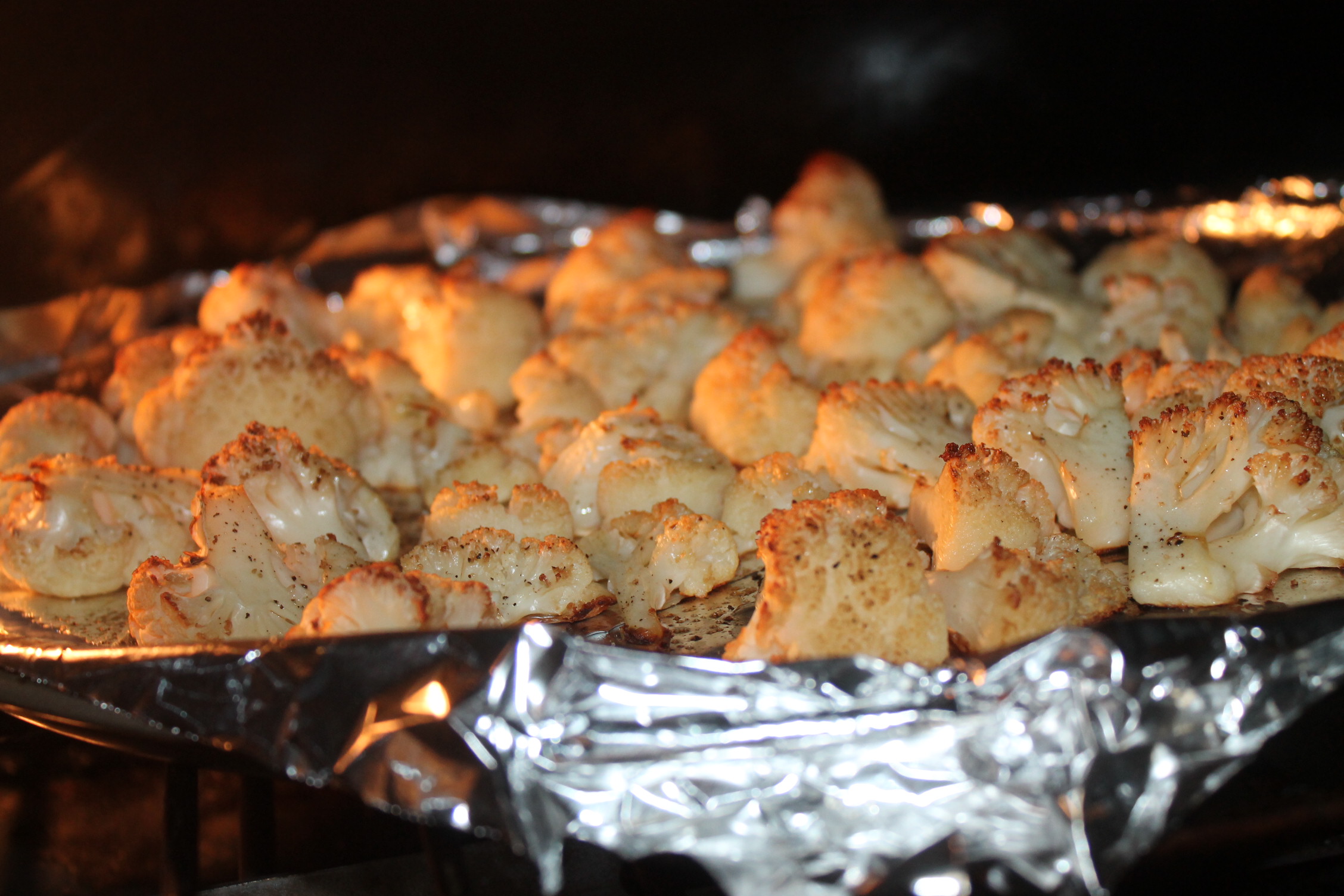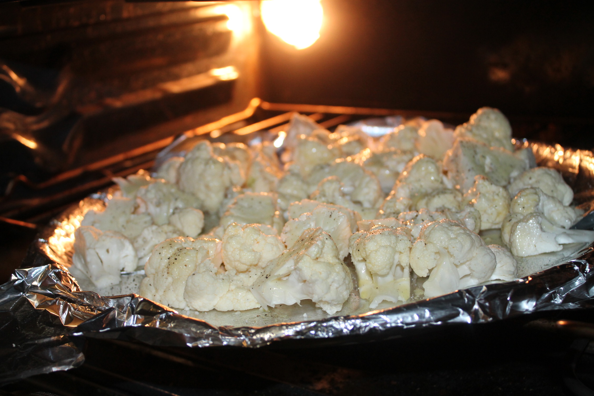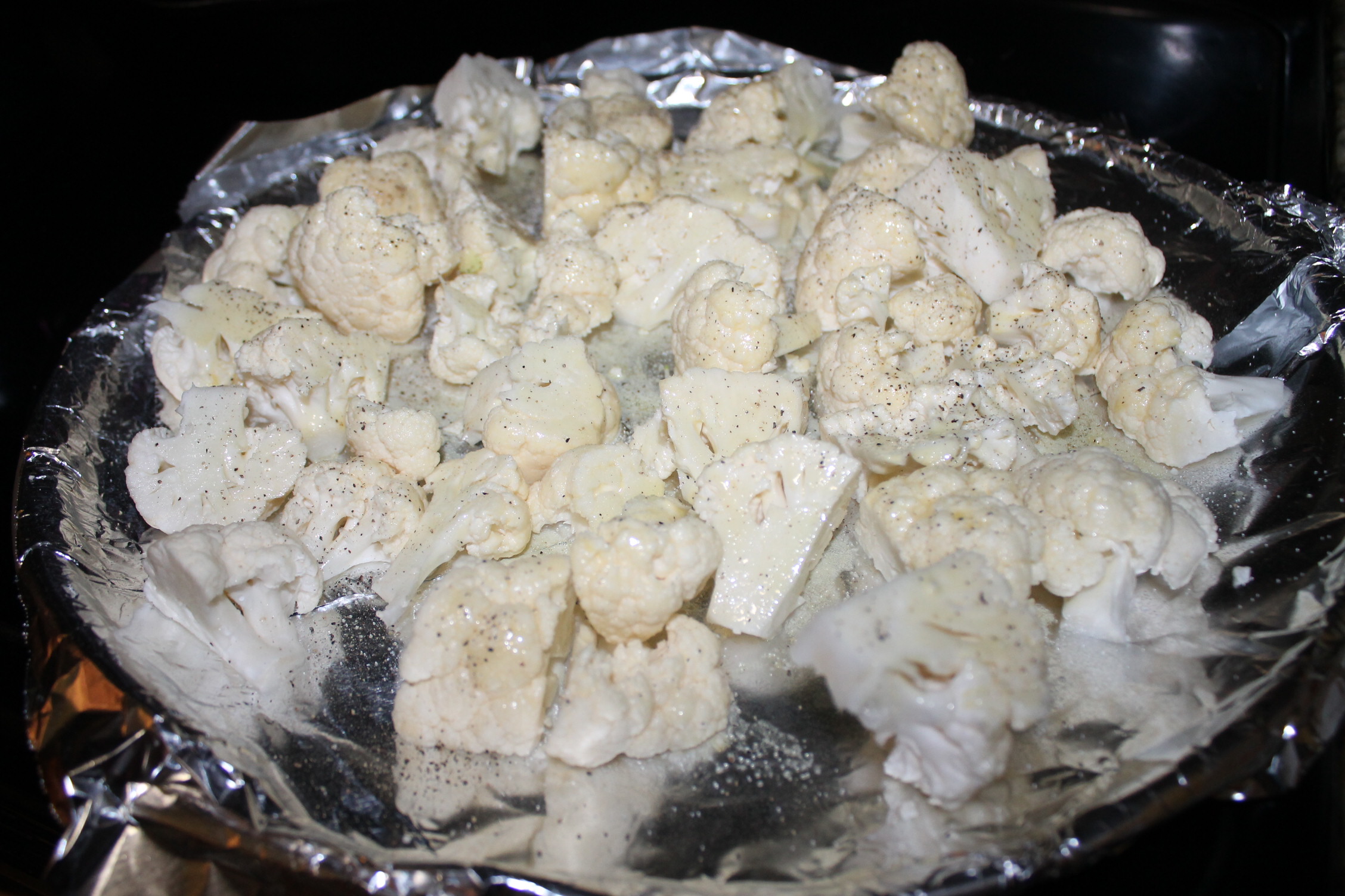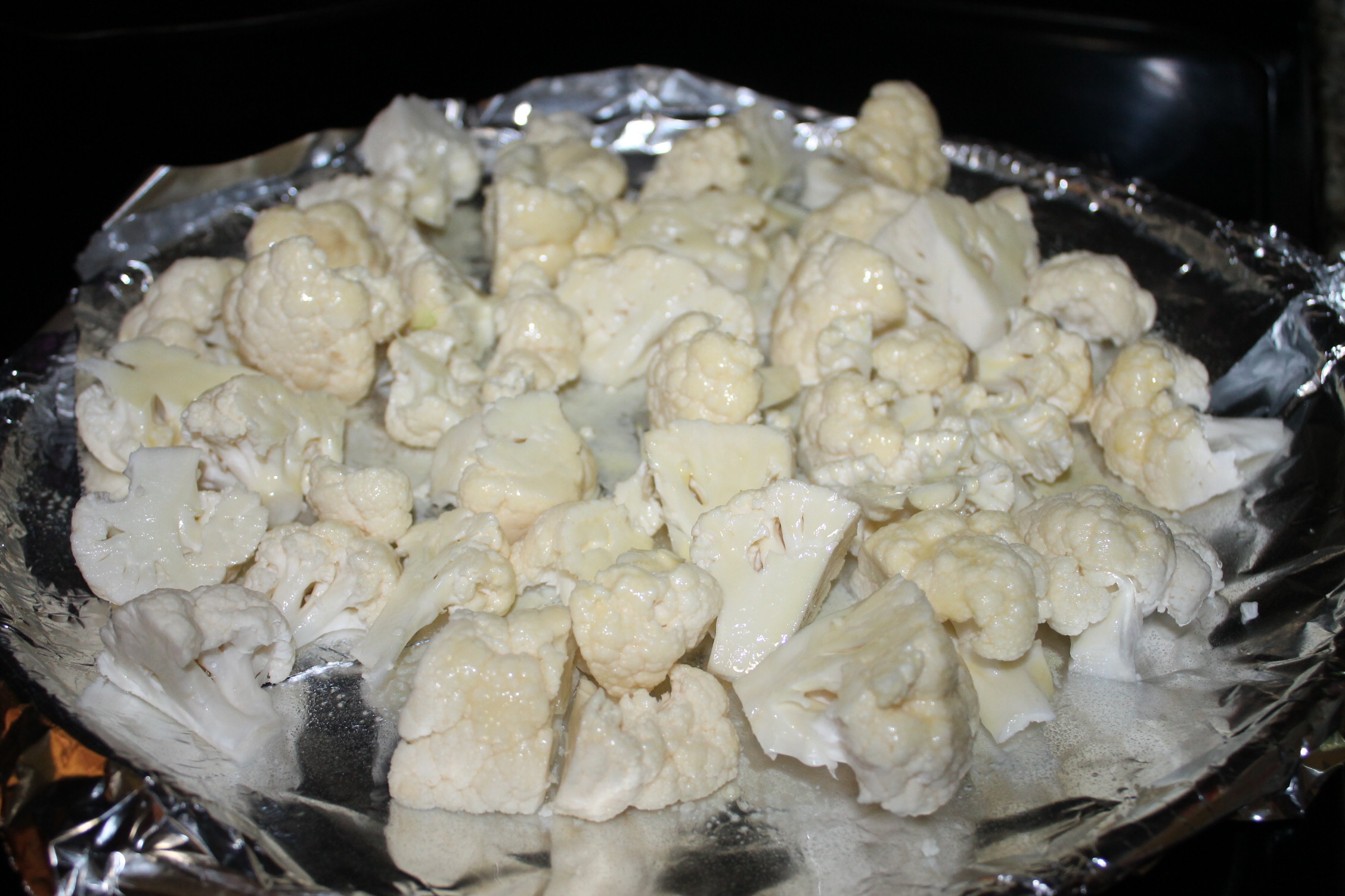 일단 콜리 플라워를 물에 씻고 이렇게 잘라 줘요. 그리고 알리미늄 보일을 쿠팡 팬에다 깔아 놓고 그 위에다 잘린 콜리 플라워를 올려놓습니다.