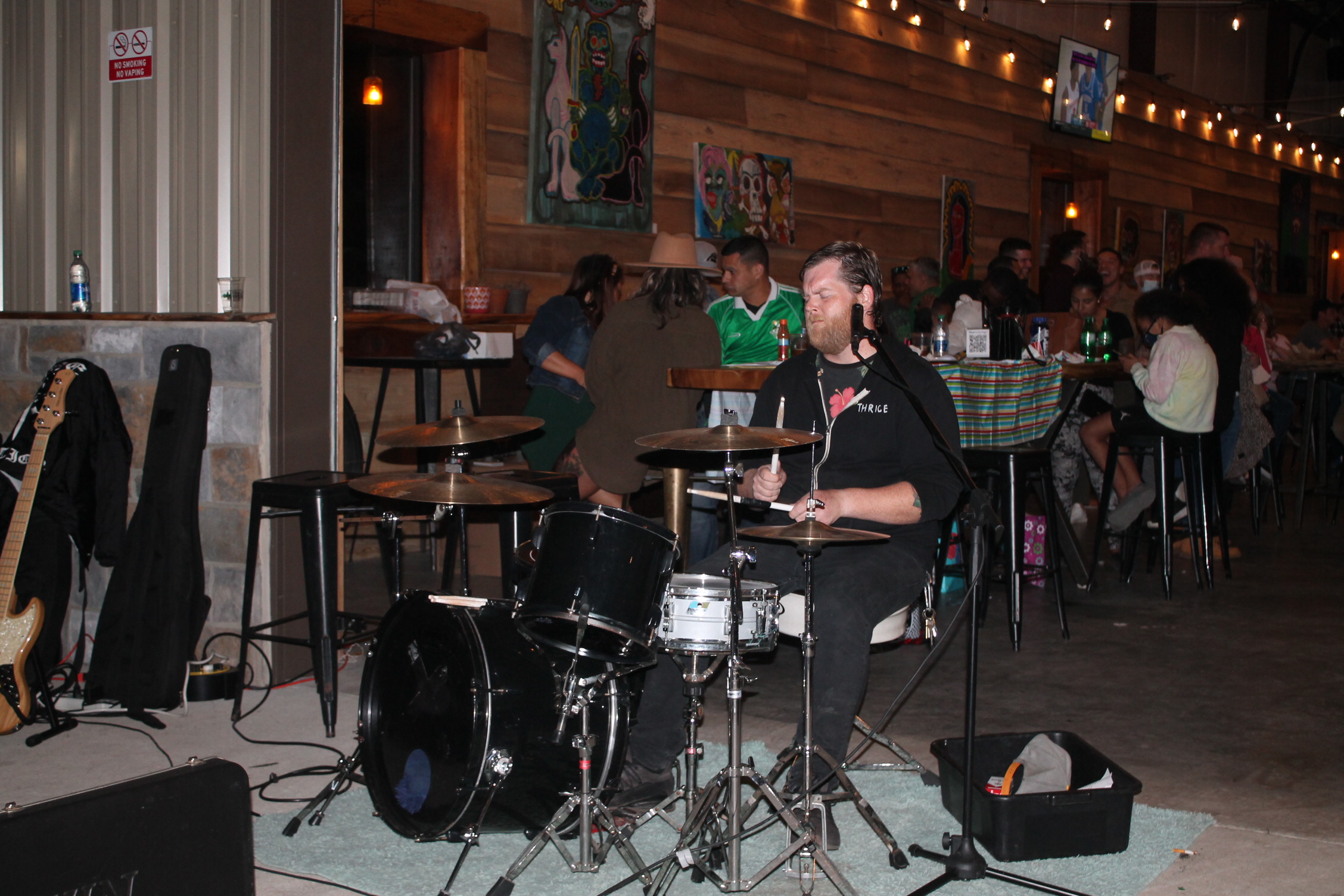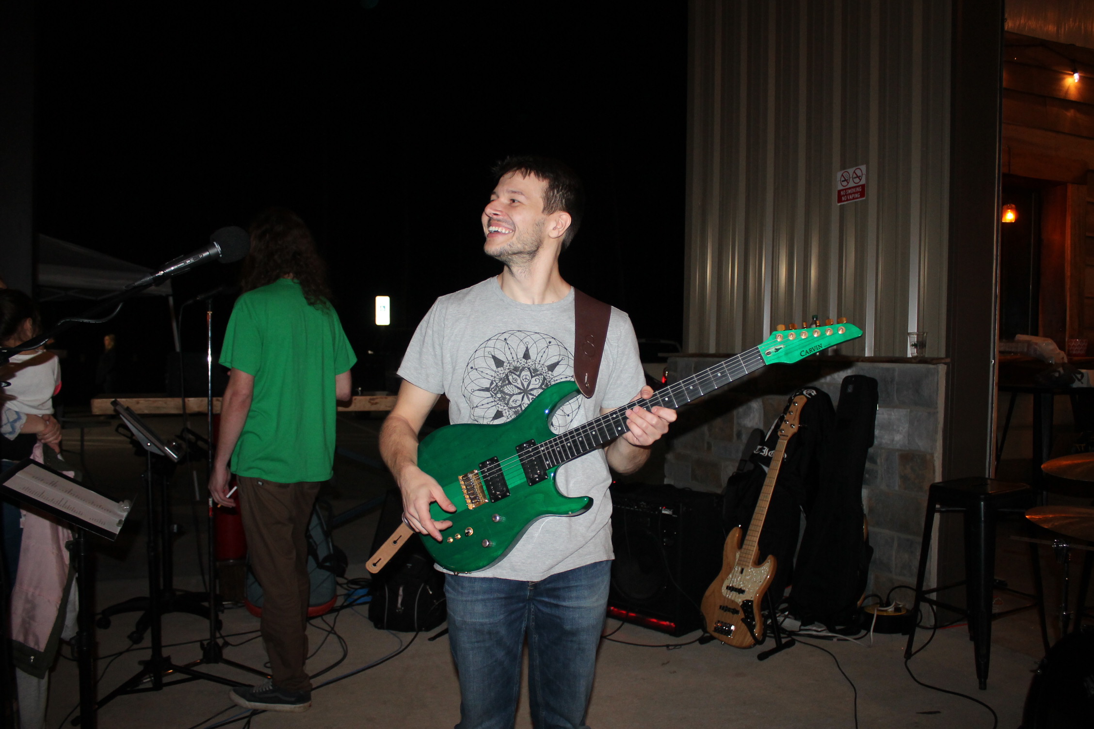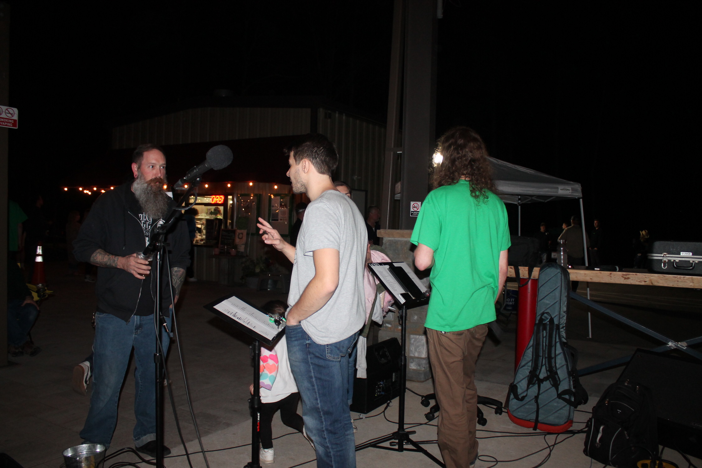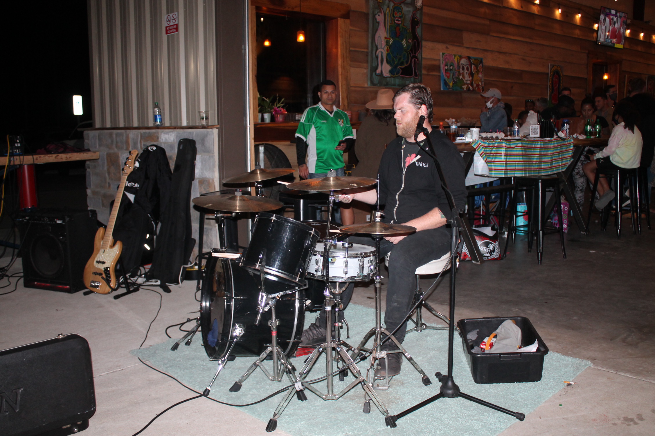 처음 이곳을 입장하려면 스탬프 도장을 찍어요. 성인 확인 가능한 신분증을 보고 확인되면 도장을 찍어 줍니다. 입장을 하니 사람이 이렇게 많이 있을 줄은 상상도 못 할 정도였어요. 수많은 관중 앞에서 연주를 하고 노래하는 분이 시선이 들어왔어요. 오. 우리 선생님이네. 정말 멋지다.라고 혼잣말했어요.