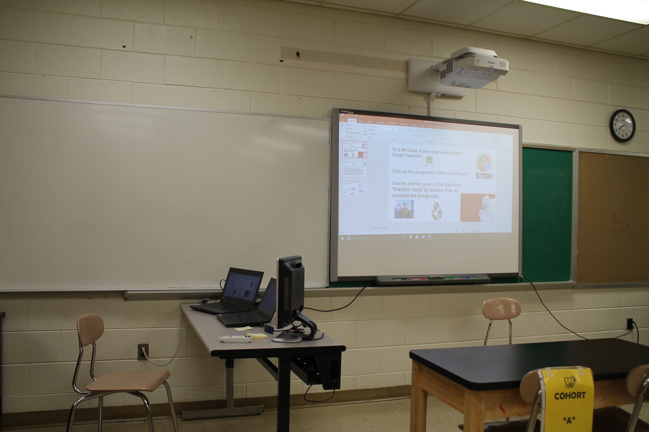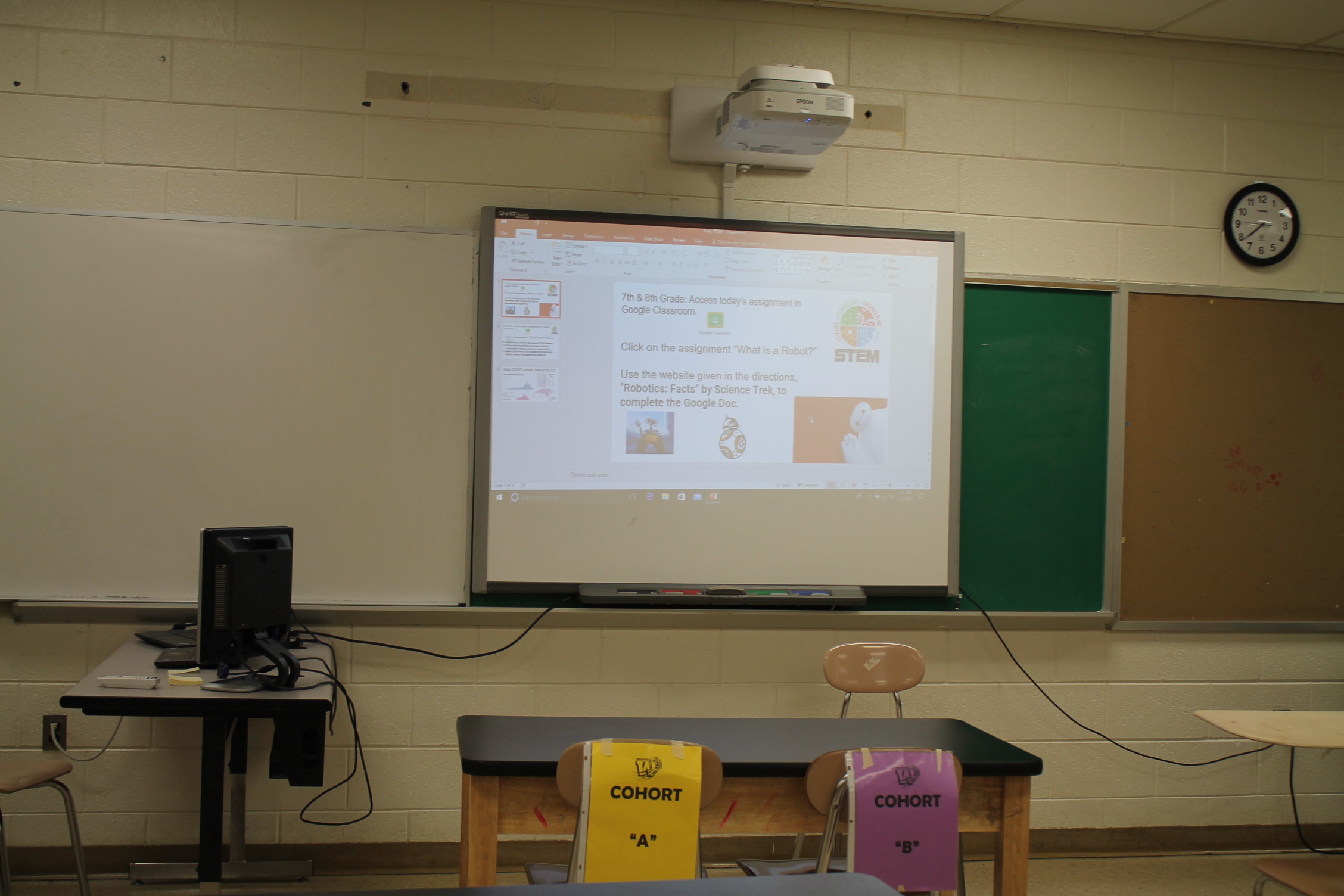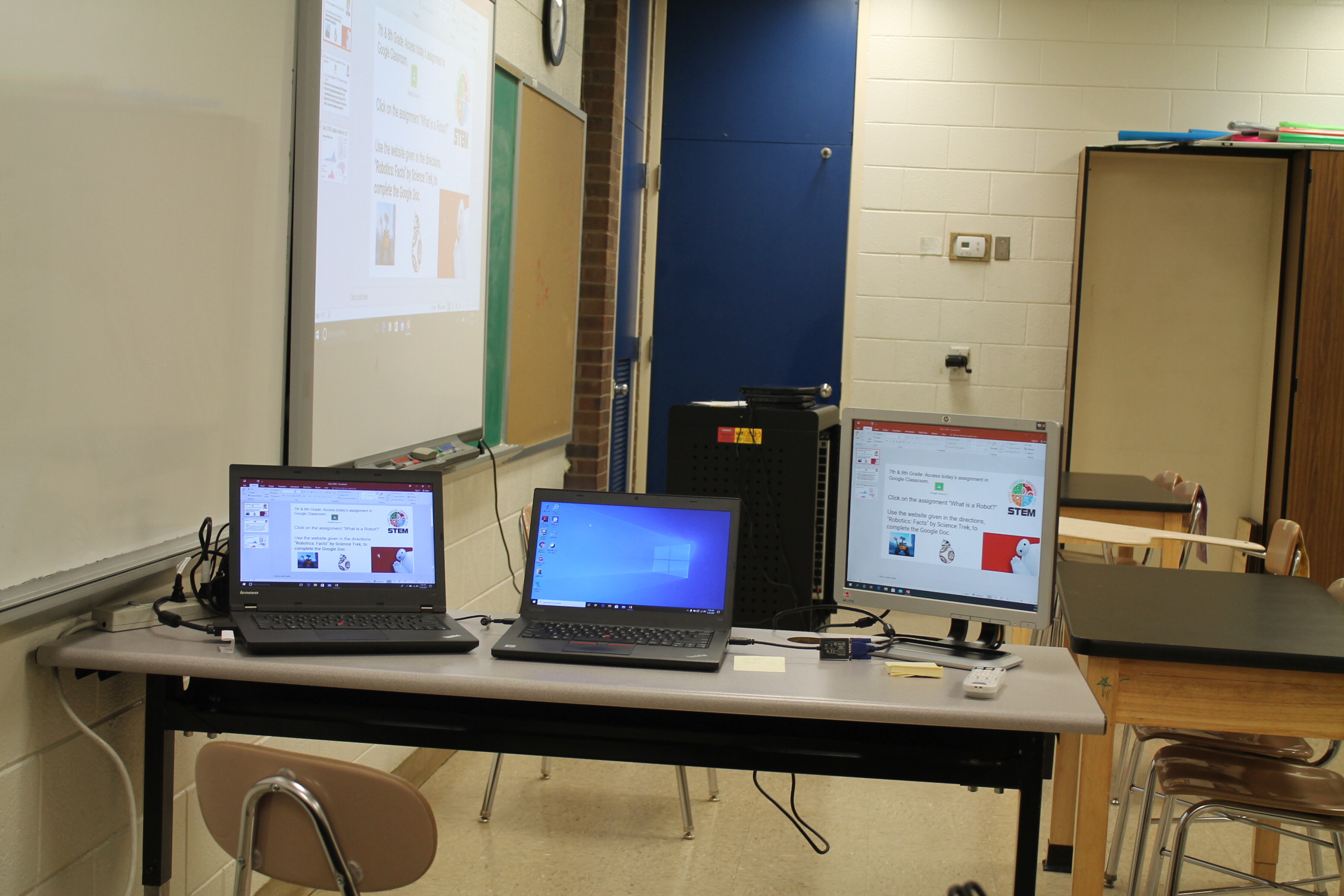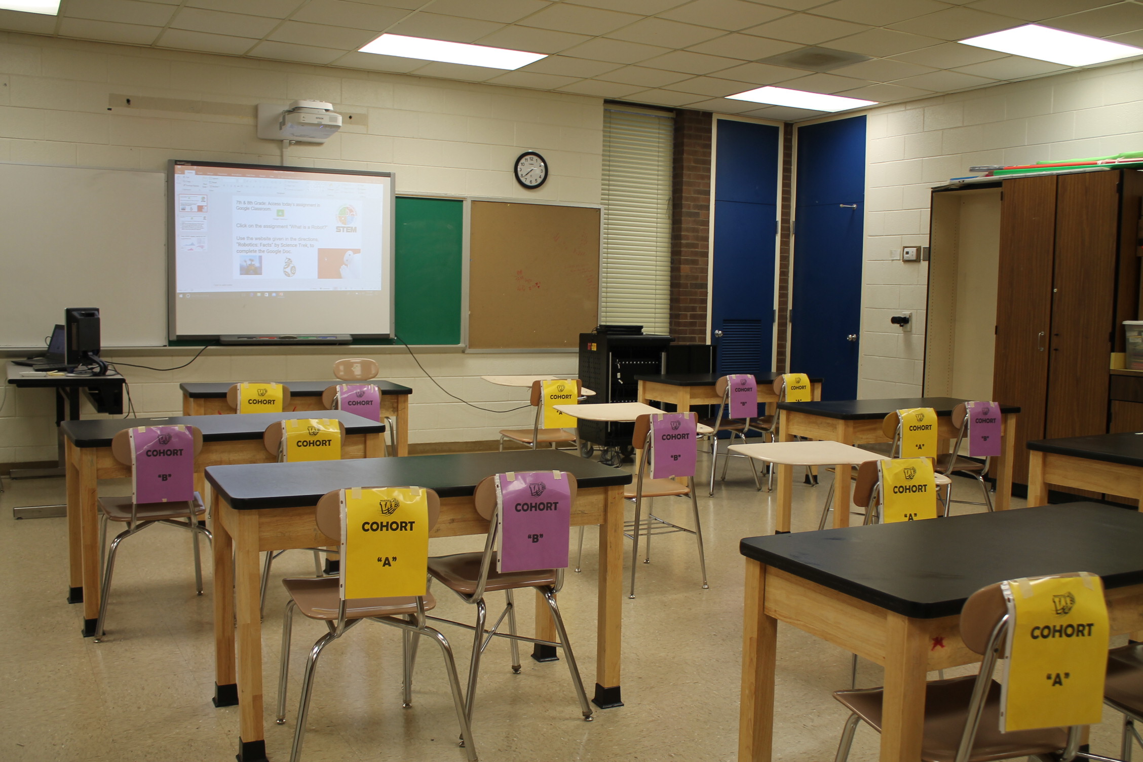 우리의 청소년이 생각해보고 느껴야 할 현실적 문제가 아닐까 생각됩니다. 이상 미국의 STEM 교육 현장을 다녀온 소감을 적어 봤습니다. 아래의 사진은 필자가 다녀왔던 학교의 교실 분위기입니다. 의자 뒤에 노란색과 보라색으로 되어 있는 표지판이 보이죠? 그것은 요일을 나누어서 학생들이 참관 수업을 하도록 만든 시스템입니다.