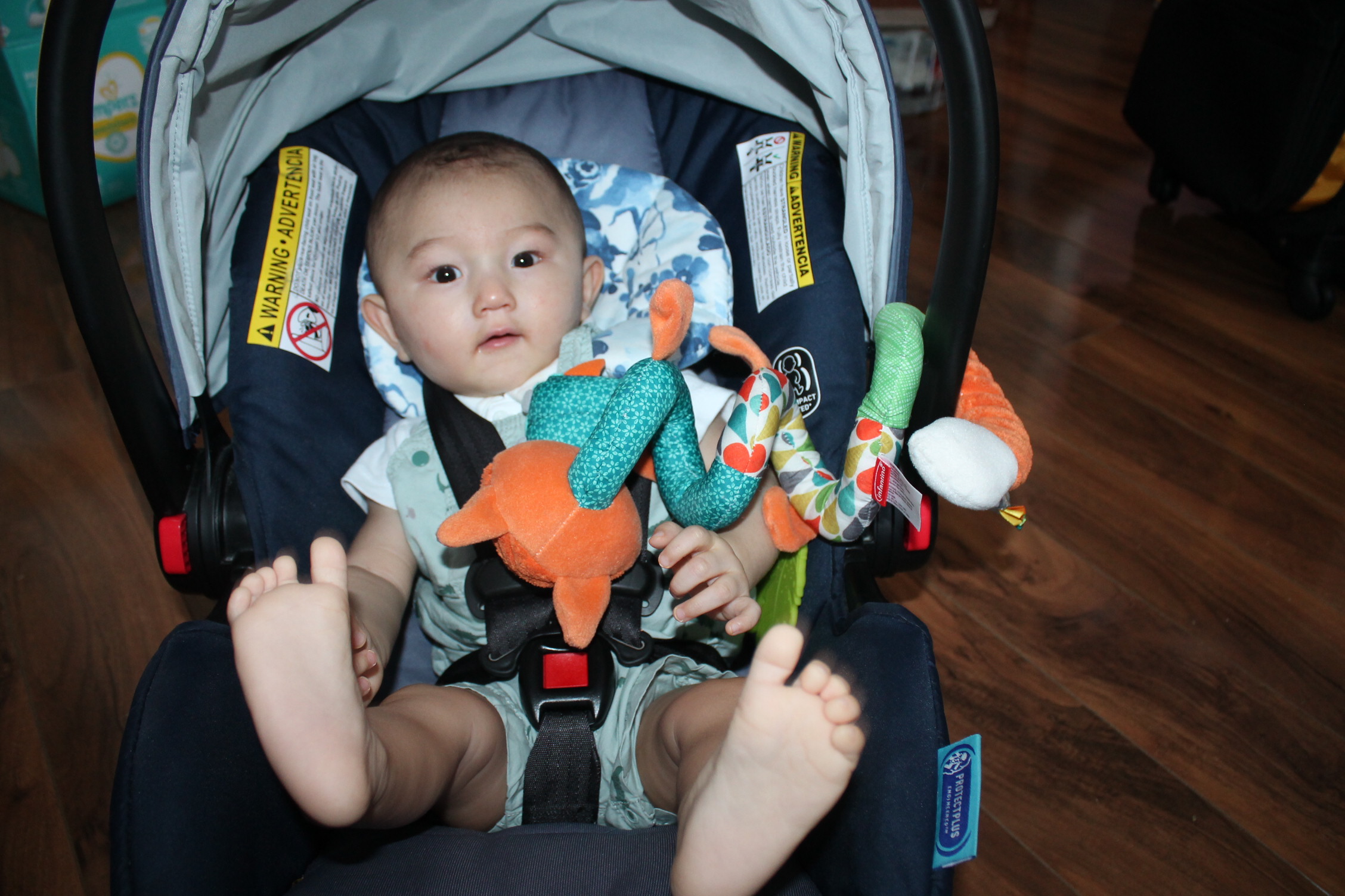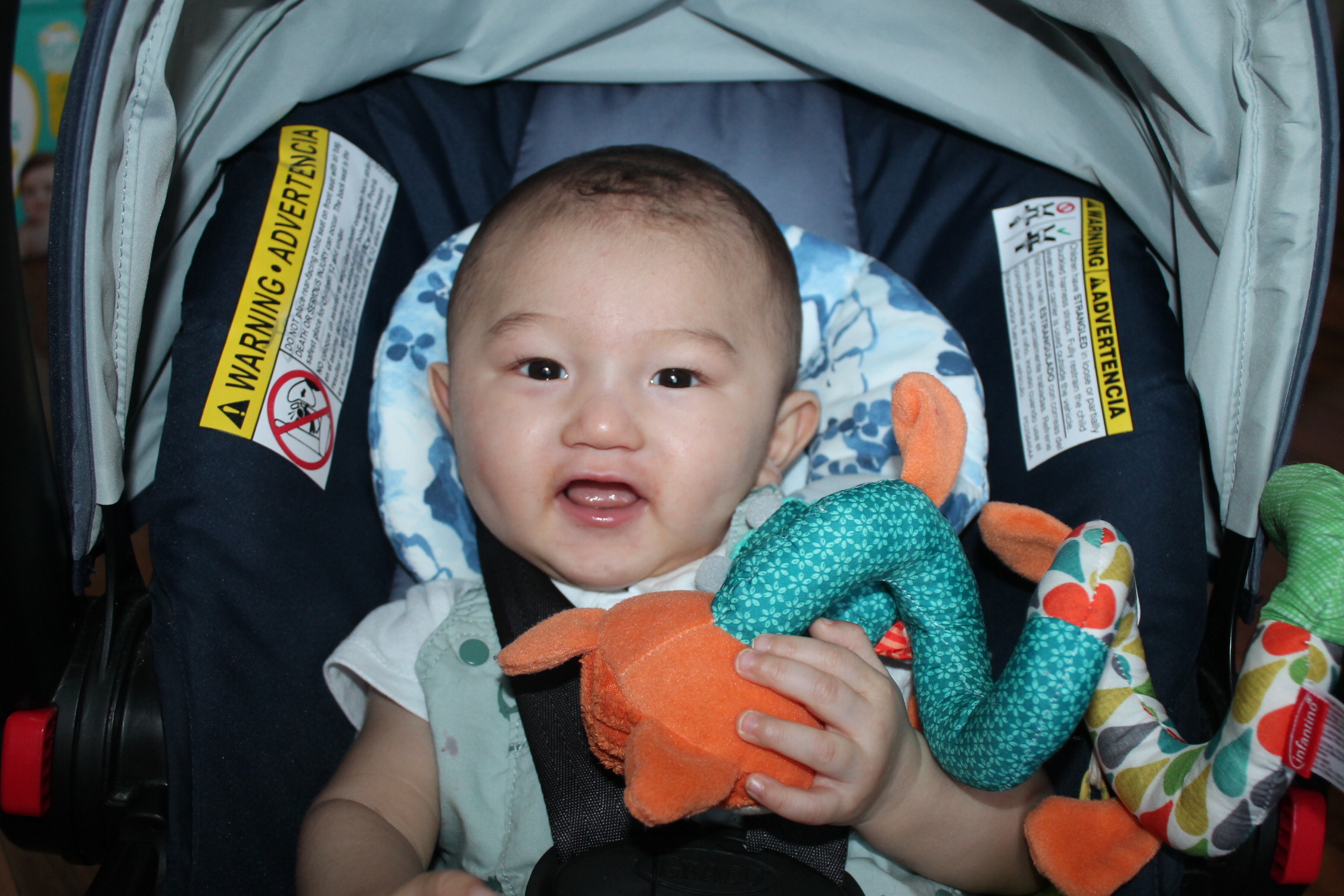 이렇게 외출할 때는 안성맞춤의 장난감이네요. 어디 분실할 염려도 없고요. 옆에다 달아 두니 손으로 잡고 쉽게 놀 수도 있어 좋았던 장난감입니다.