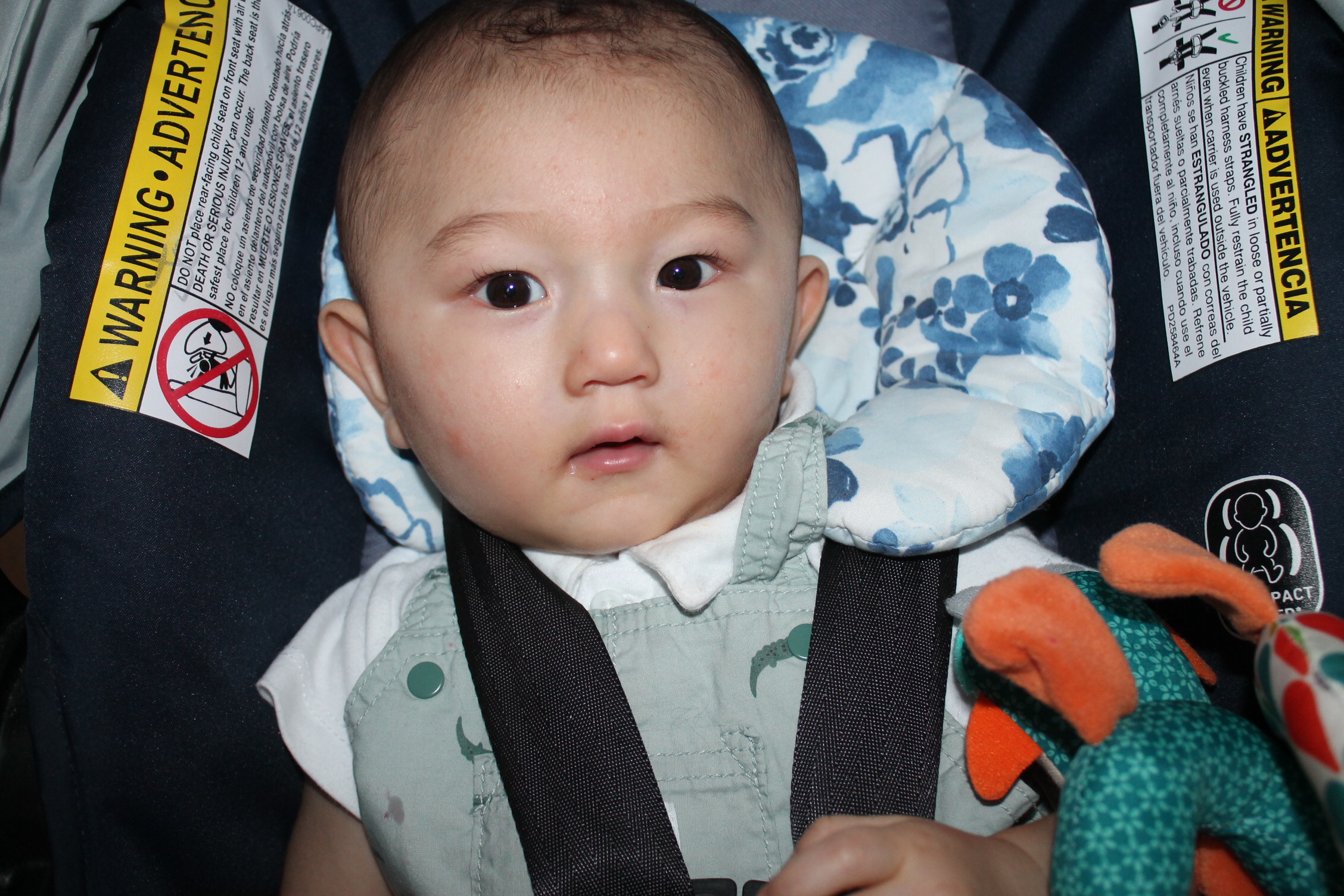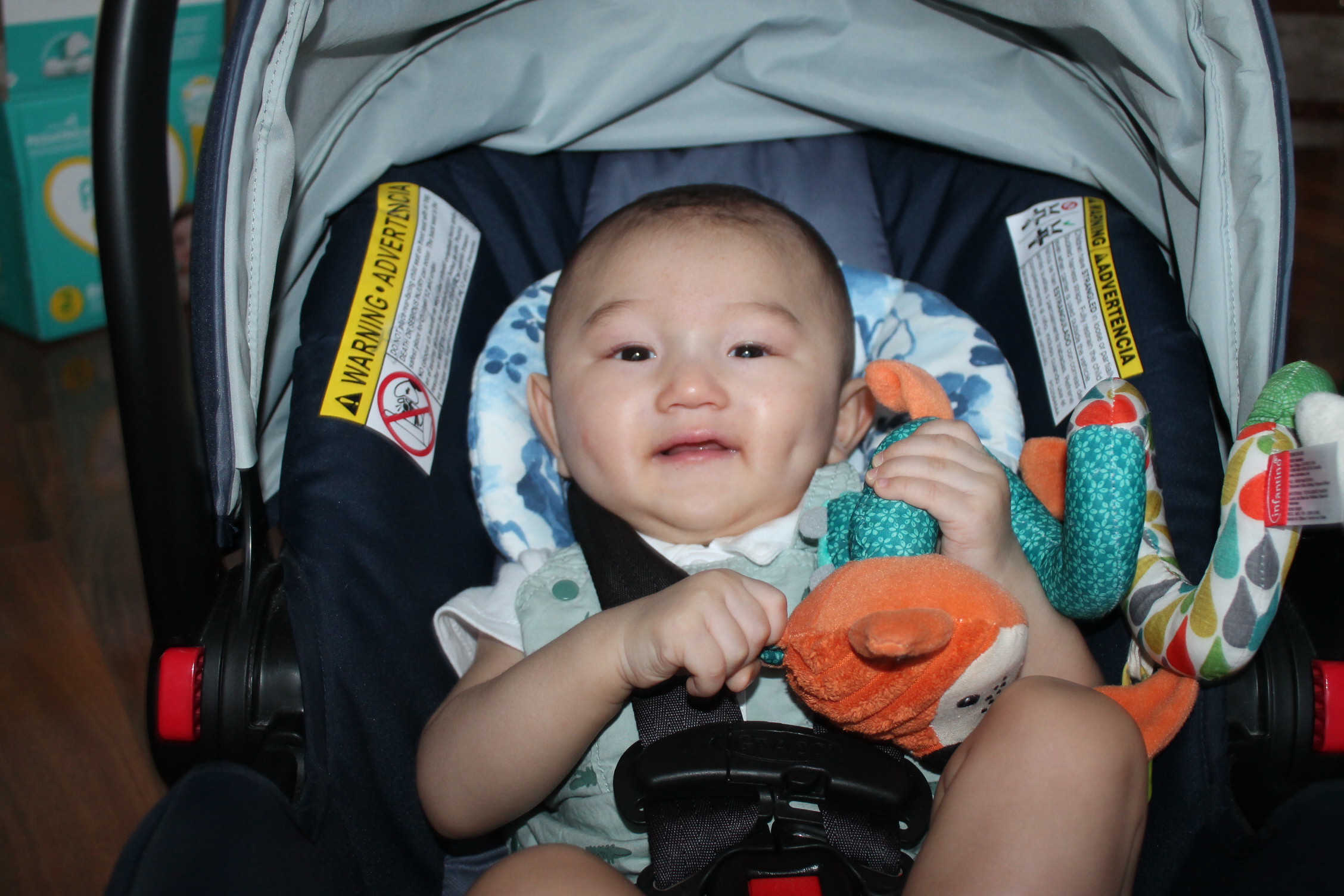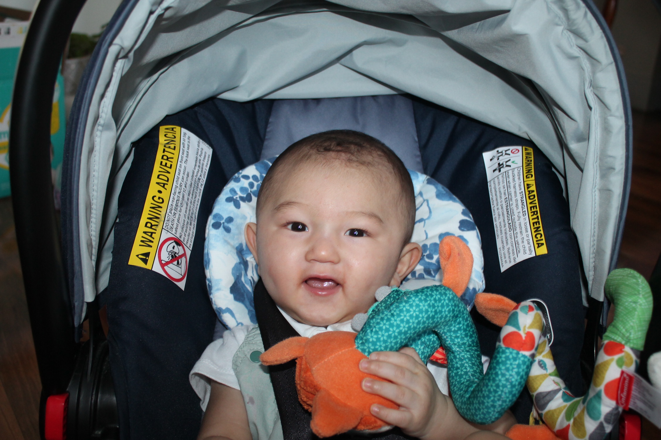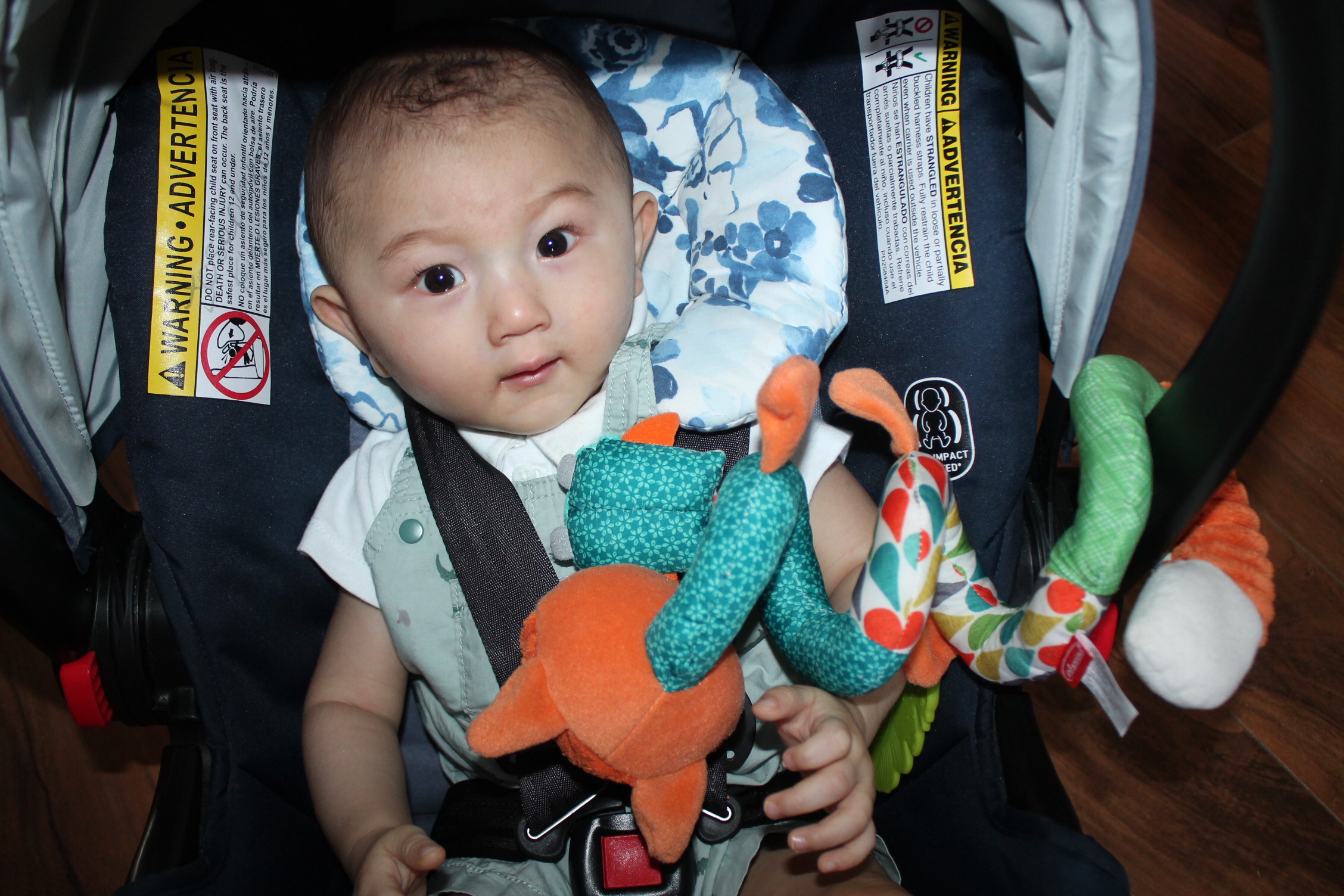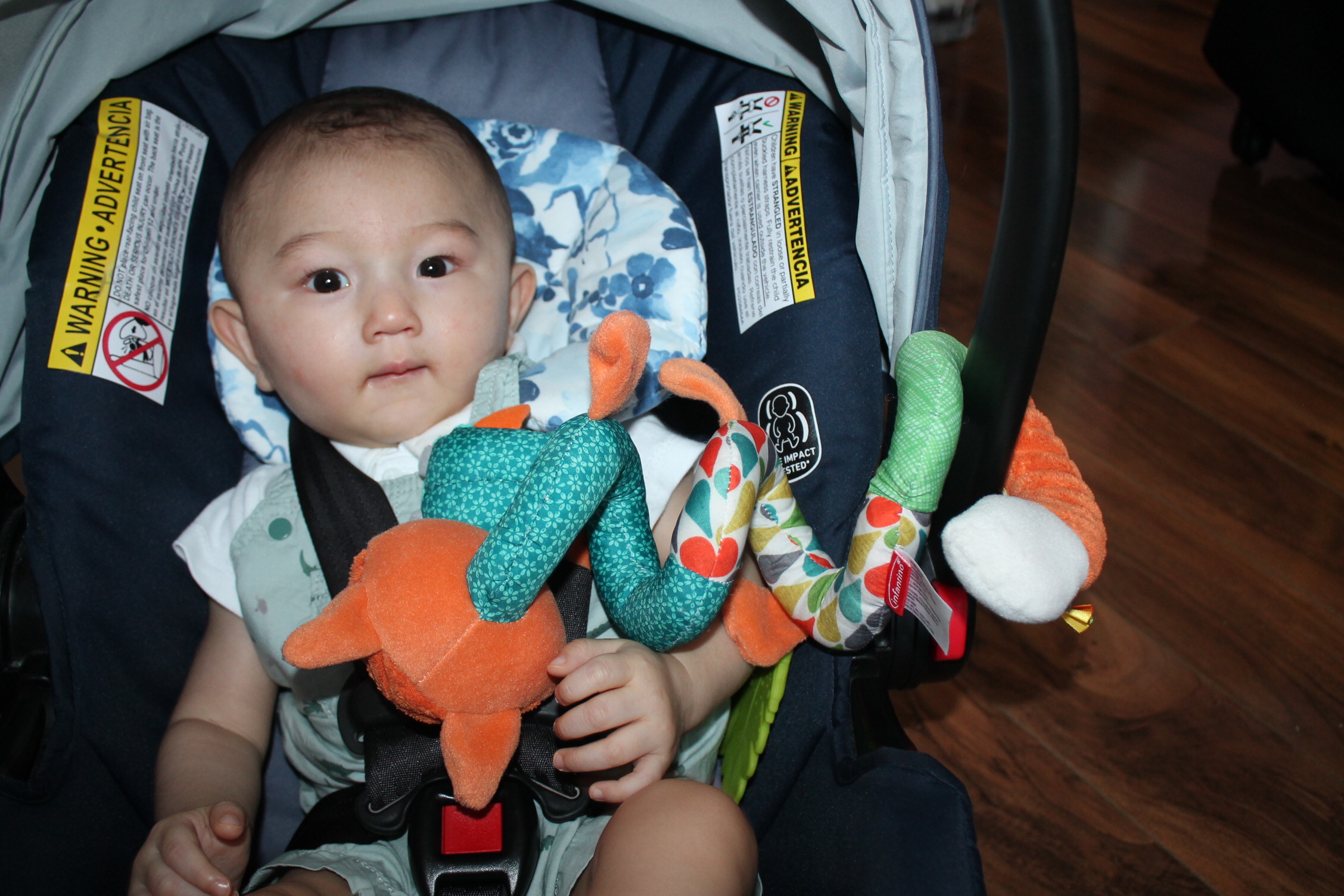 노엘이 신나게 놀자고 하는데 뭘 가지고 놀지 궁금하시죠? 바로 카 시트 옆에 달아 두었던 인형인데요. 이 인형을 가지고 노는 것을 좋아해요.
