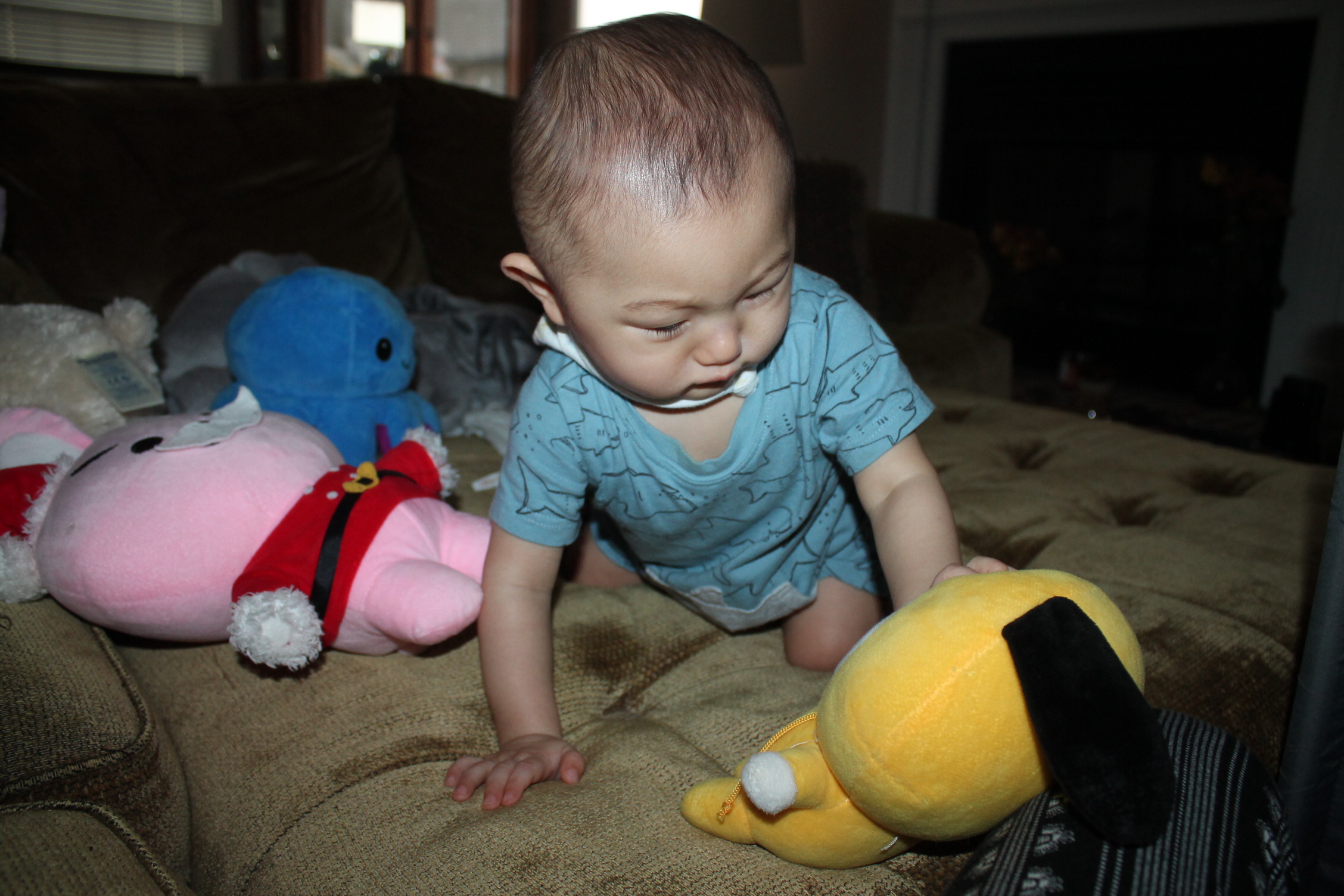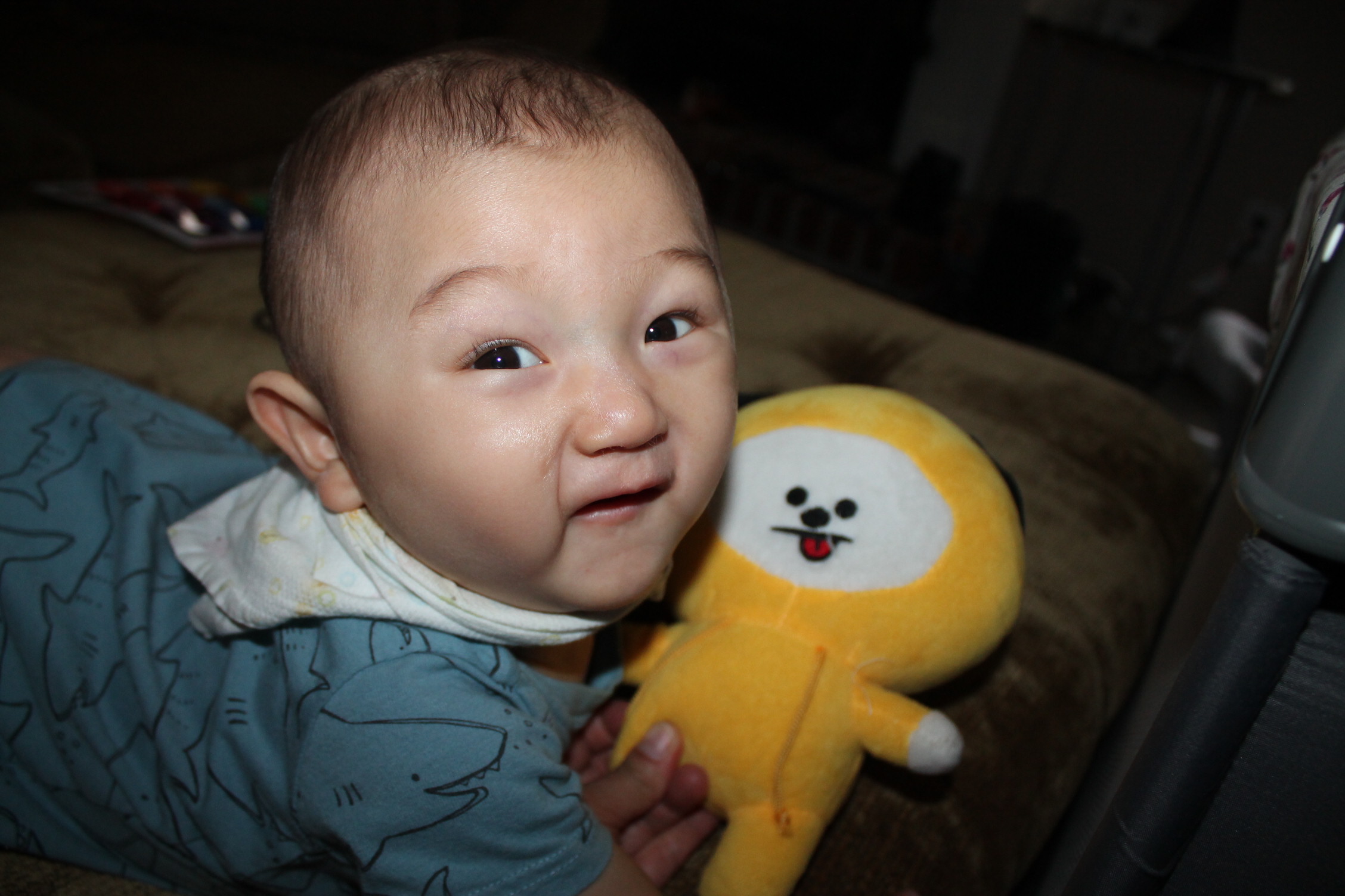노엘은 치미 인형을 가지고 놉니다. 처음 방탄소년단 치미를 소개해줬을 때 아주 좋아했어요. 이렇게 가지고 노는 모습을 담아 봤습니다. 참고로 치미는 방탄소년단의 지민의 마스코트입니다.