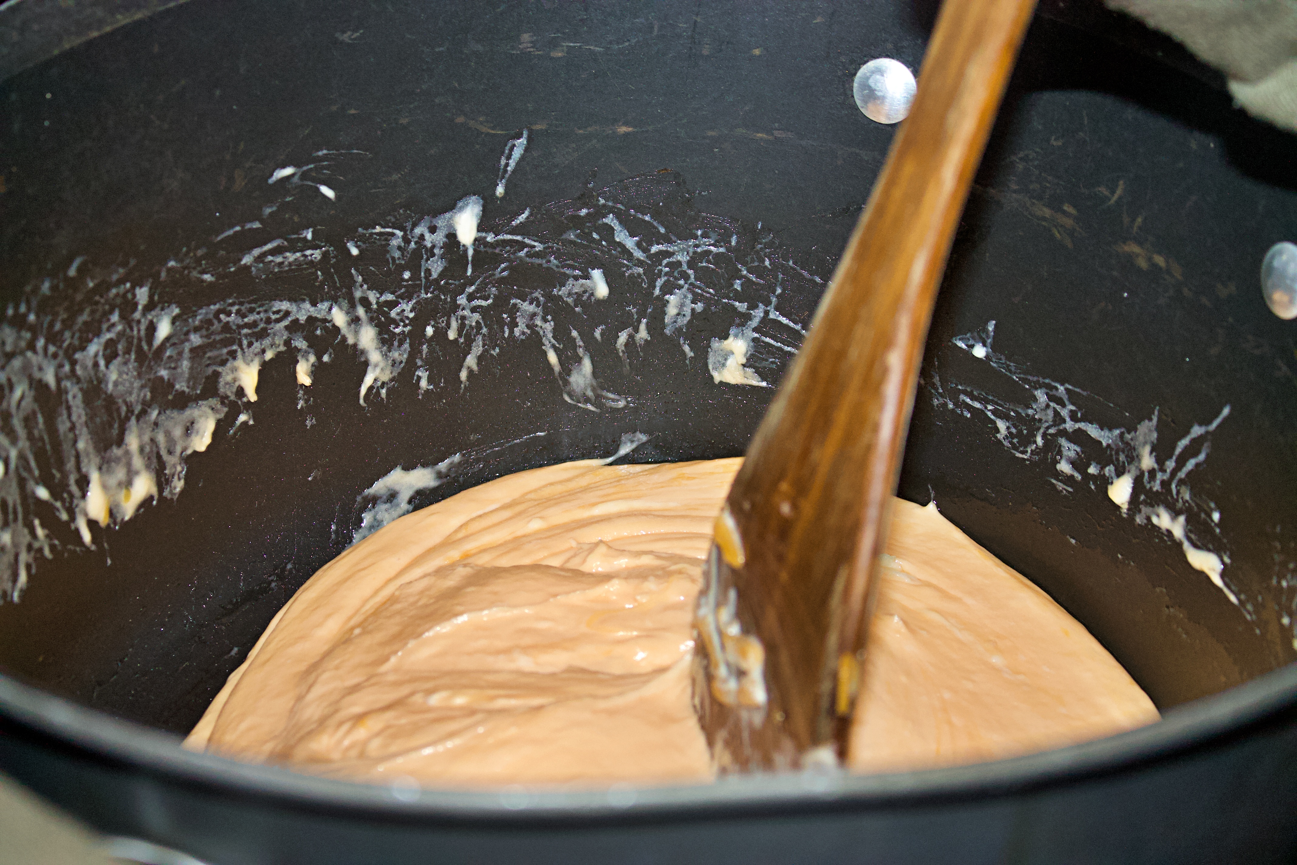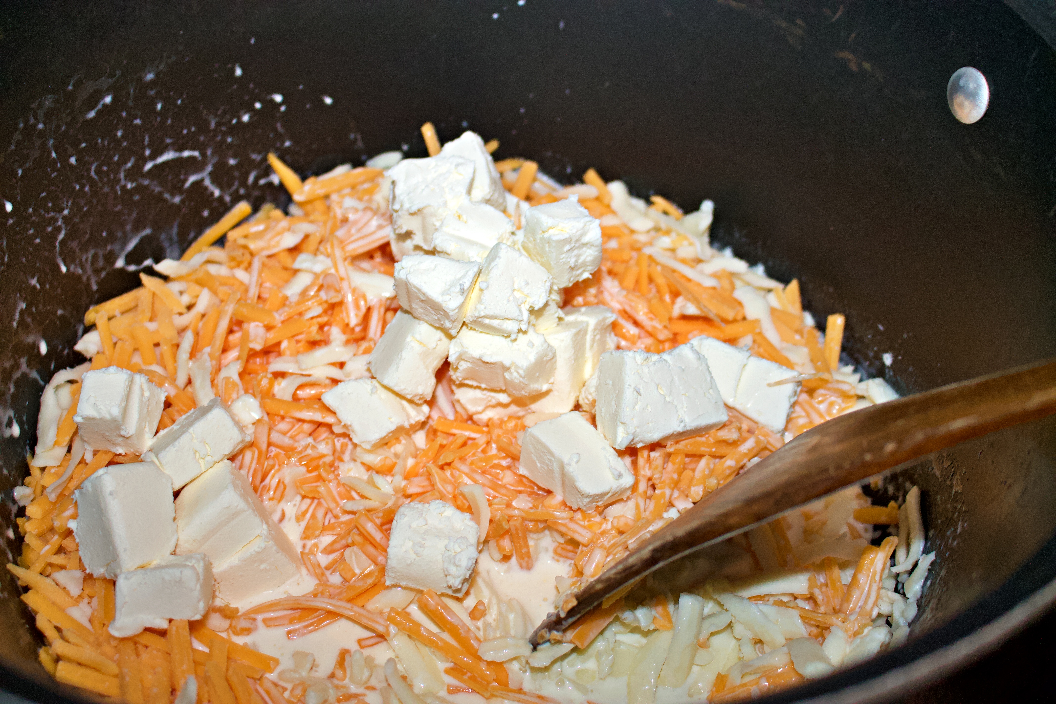 이렇게 큰 냄비에다 다 넣고 약한 불로 조절해서 치즈가 다 녹을 때까지 저어 줍니다.