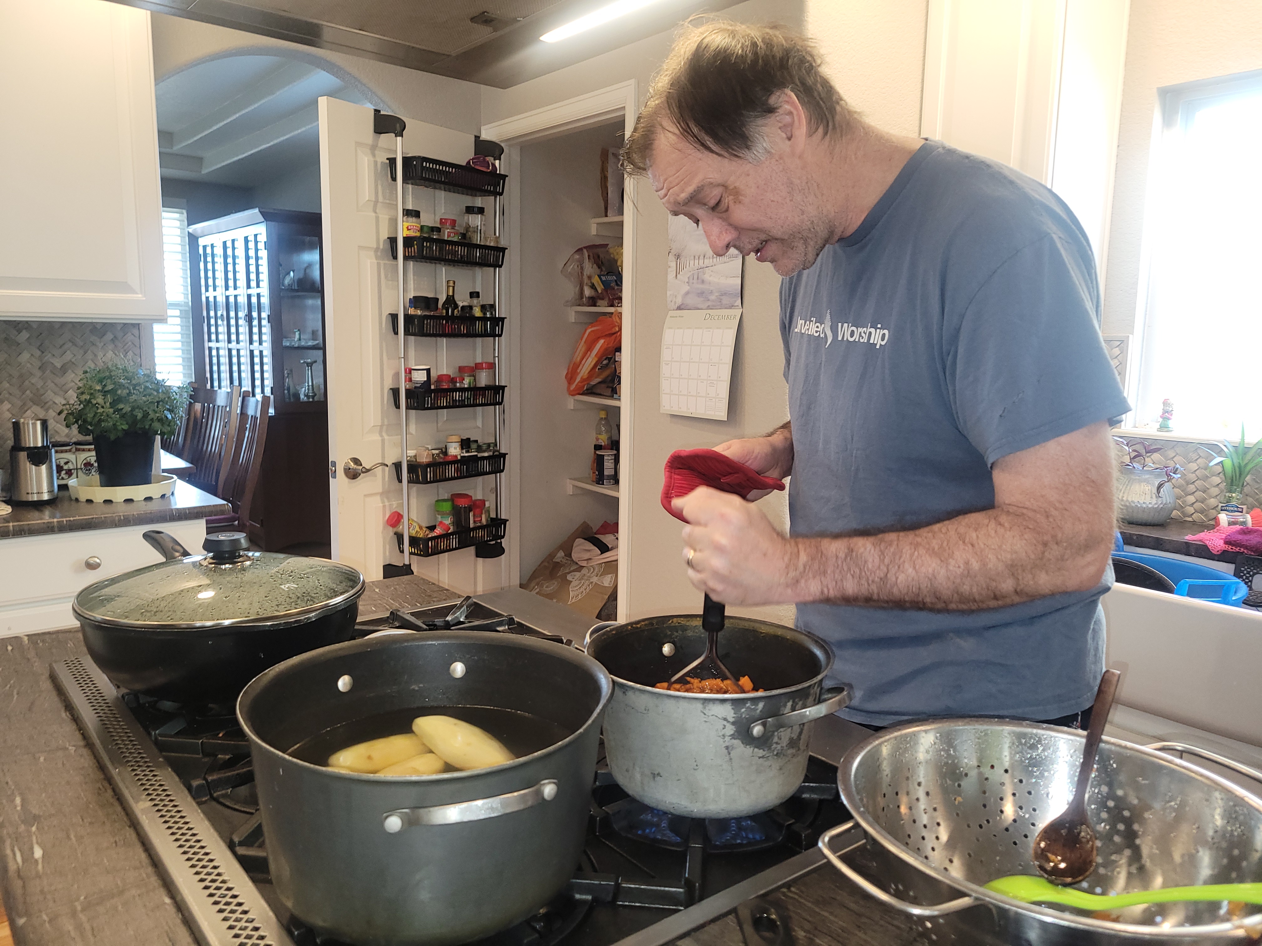 He cooks with all his might.