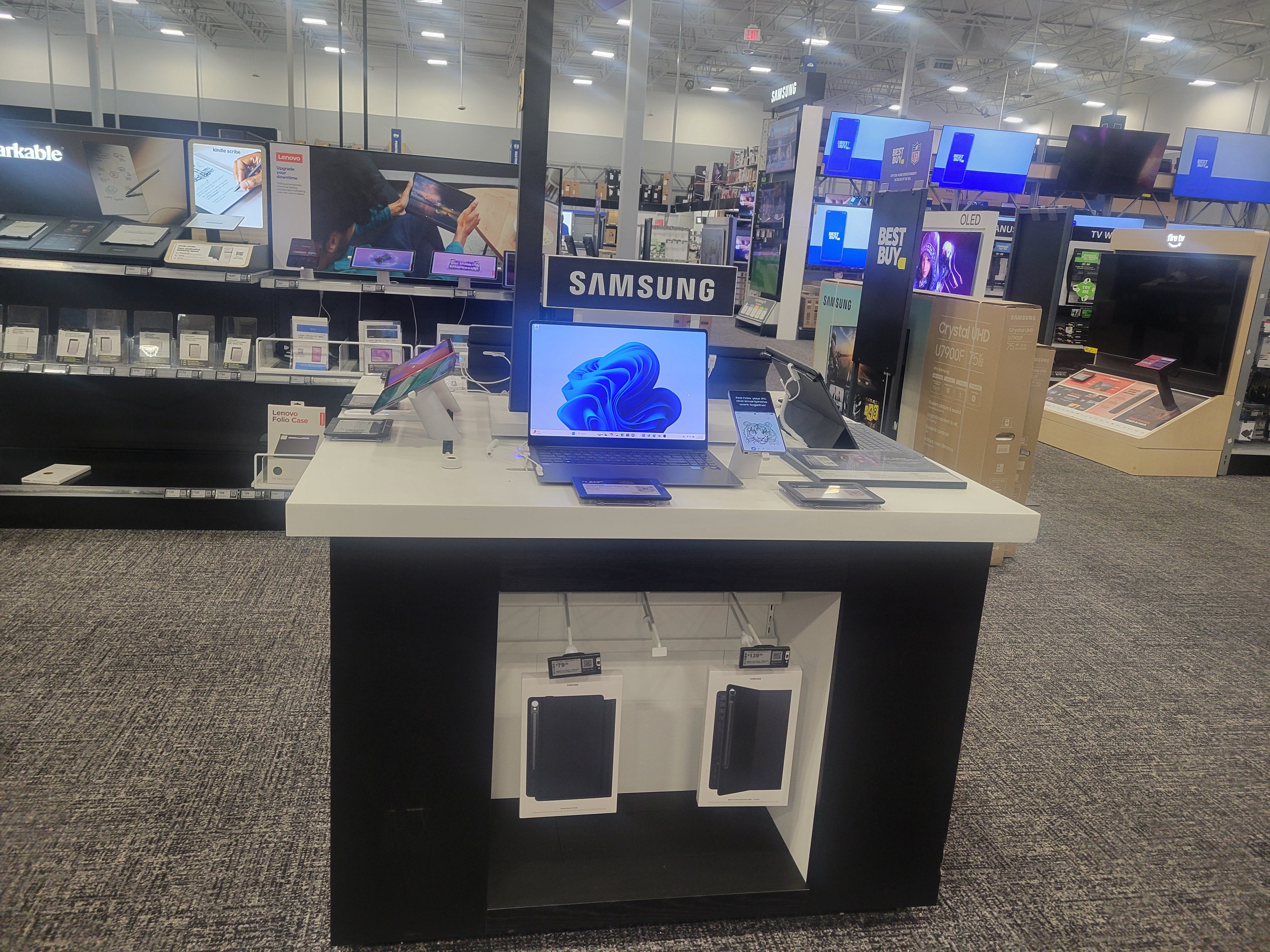 여러 나라의 제품들이 있어요. 특히 한국의 삼성 제품이 눈에 들어옵니다.